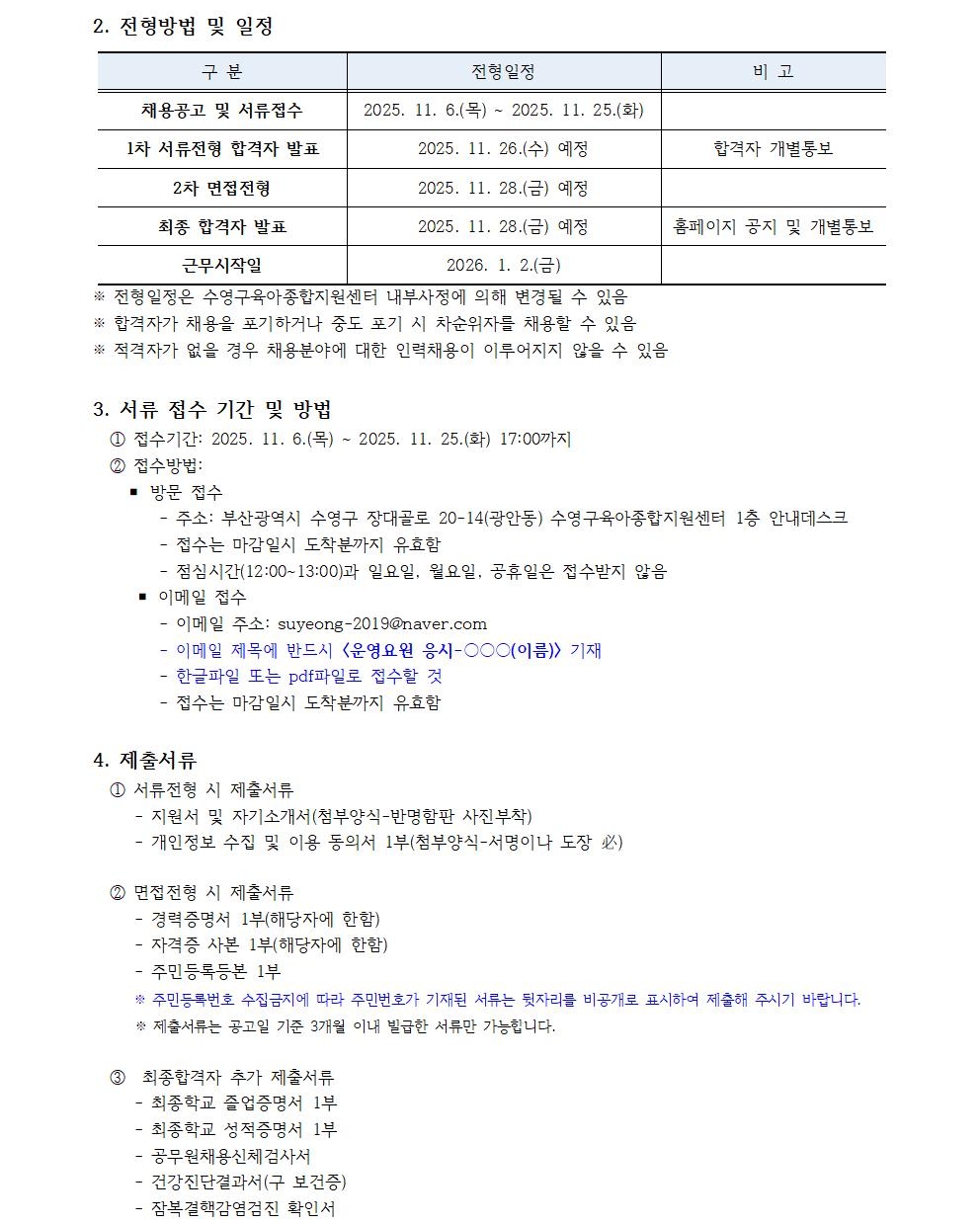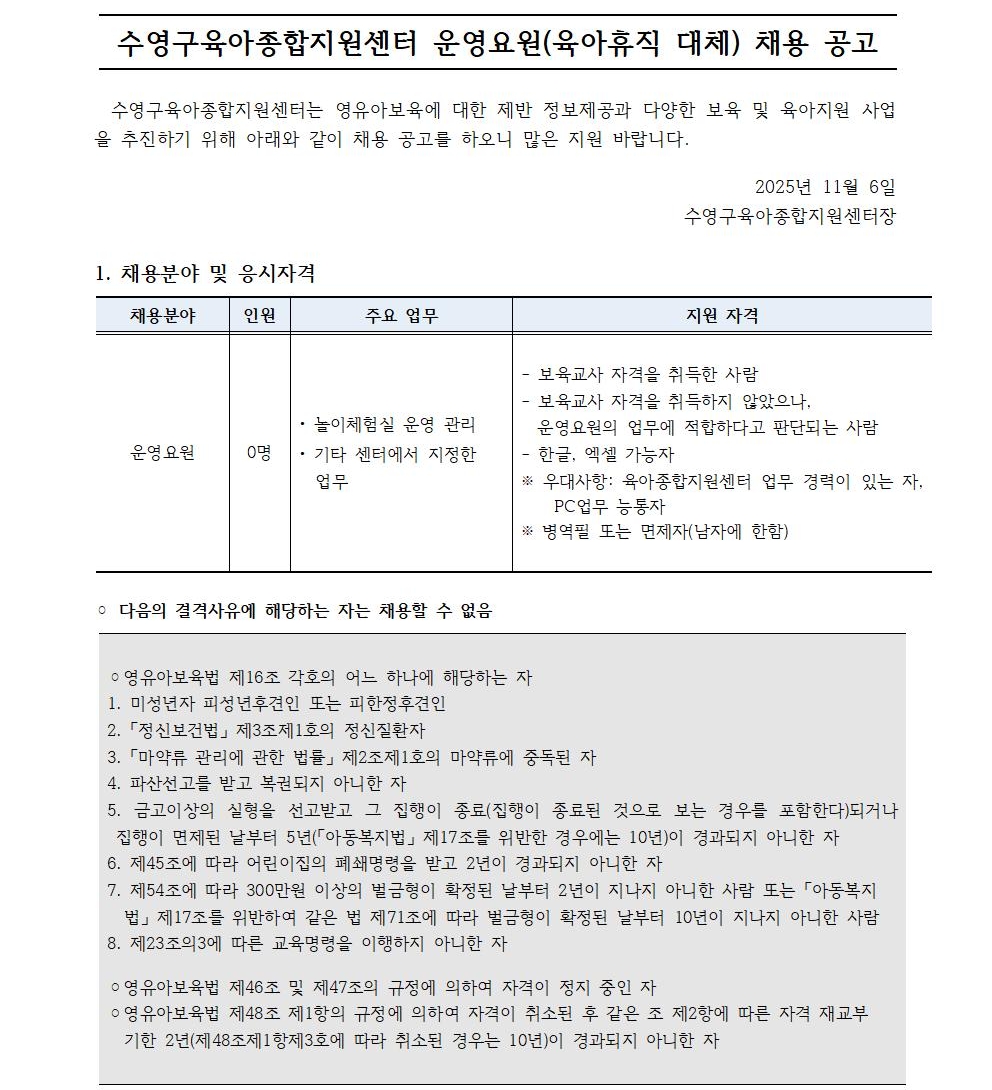 [°ø°í] ¼ö¿µ±¸À°¾ÆÁ¾ÇÕÁö¿ø¼¾ÅÍ ¿î¿µ¿ä¿ø(À°¾ÆÈÞÁ÷ ´ëü) ä¿ë °ø°í
