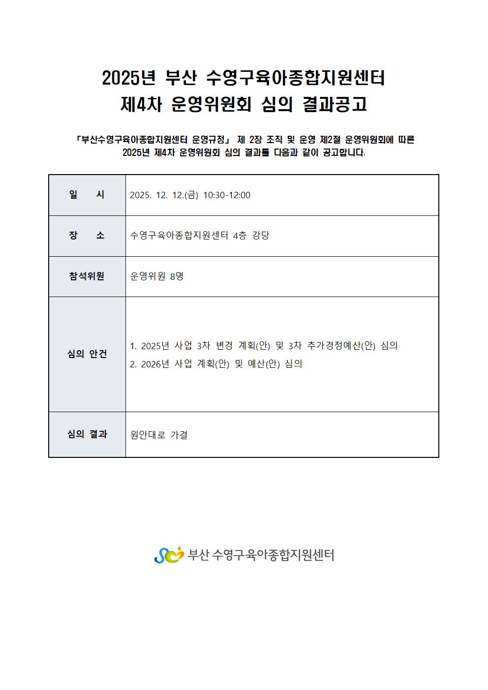 [°ø°í] 2025³â Á¦4Â÷ ¼ö¿µ±¸À°¾ÆÁ¾ÇÕÁö¿ø¼¾ÅÍ ¿î¿µÀ§¿øÈ¸ ½ÉÀÇ °á°ú ¾È³»
