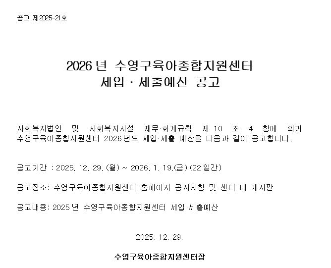 [°ø°í] 2026³â ¼ö¿µ±¸À°¾ÆÁ¾ÇÕÁö¿ø¼¾ÅÍ ¼¼ÀÔ¡¤¼¼Ãâ ¿¹»ê