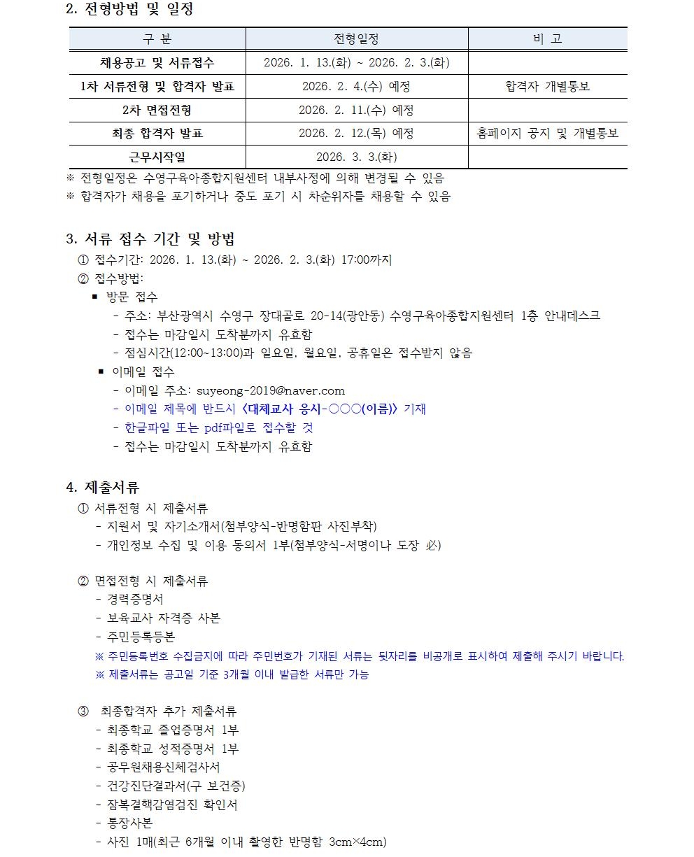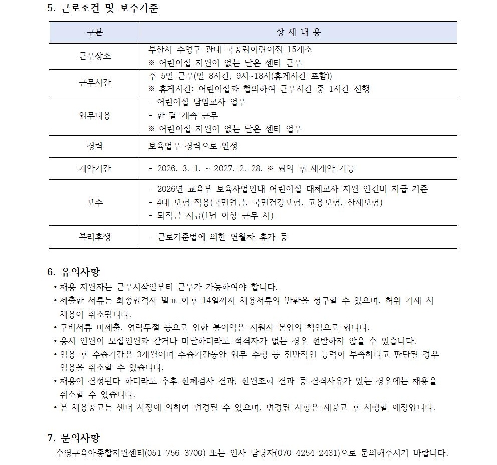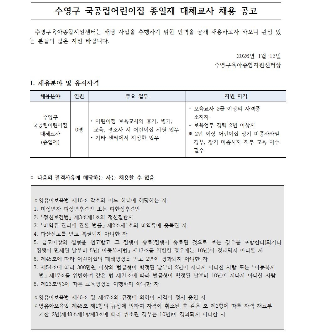 [°ø°í] ¼ö¿µ±¸ À°¾ÆÁ¾ÇÕÁö¿ø¼¾ÅÍ Á÷¿ø(Á¾ÀÏÁ¦´ëü±³»ç) ä¿ë