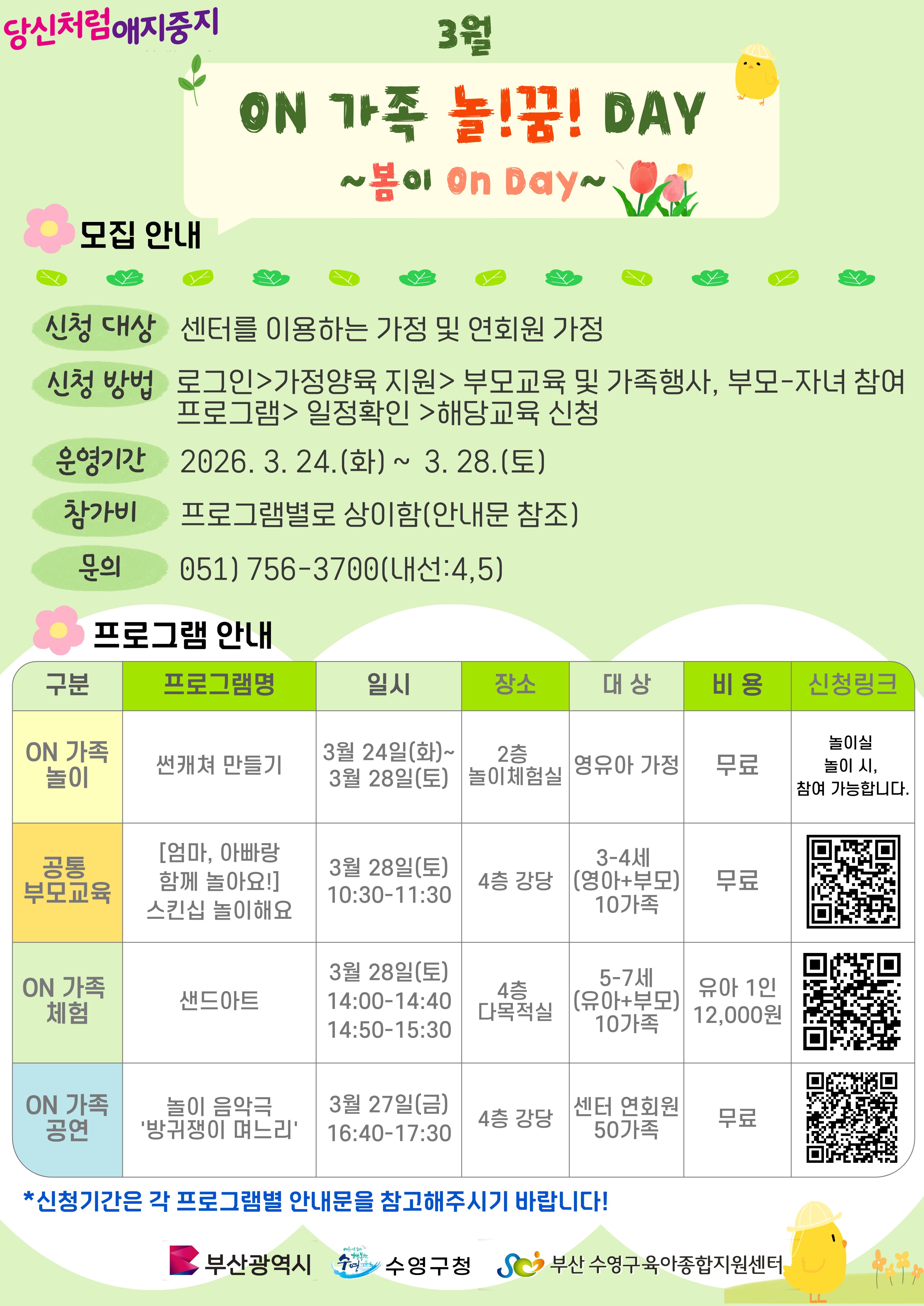 ![]() 2026³â 3¿ù ON °¡Á· ³î!²Þ! DAY ÀÏÁ¤ÀÔ´Ï´Ù.