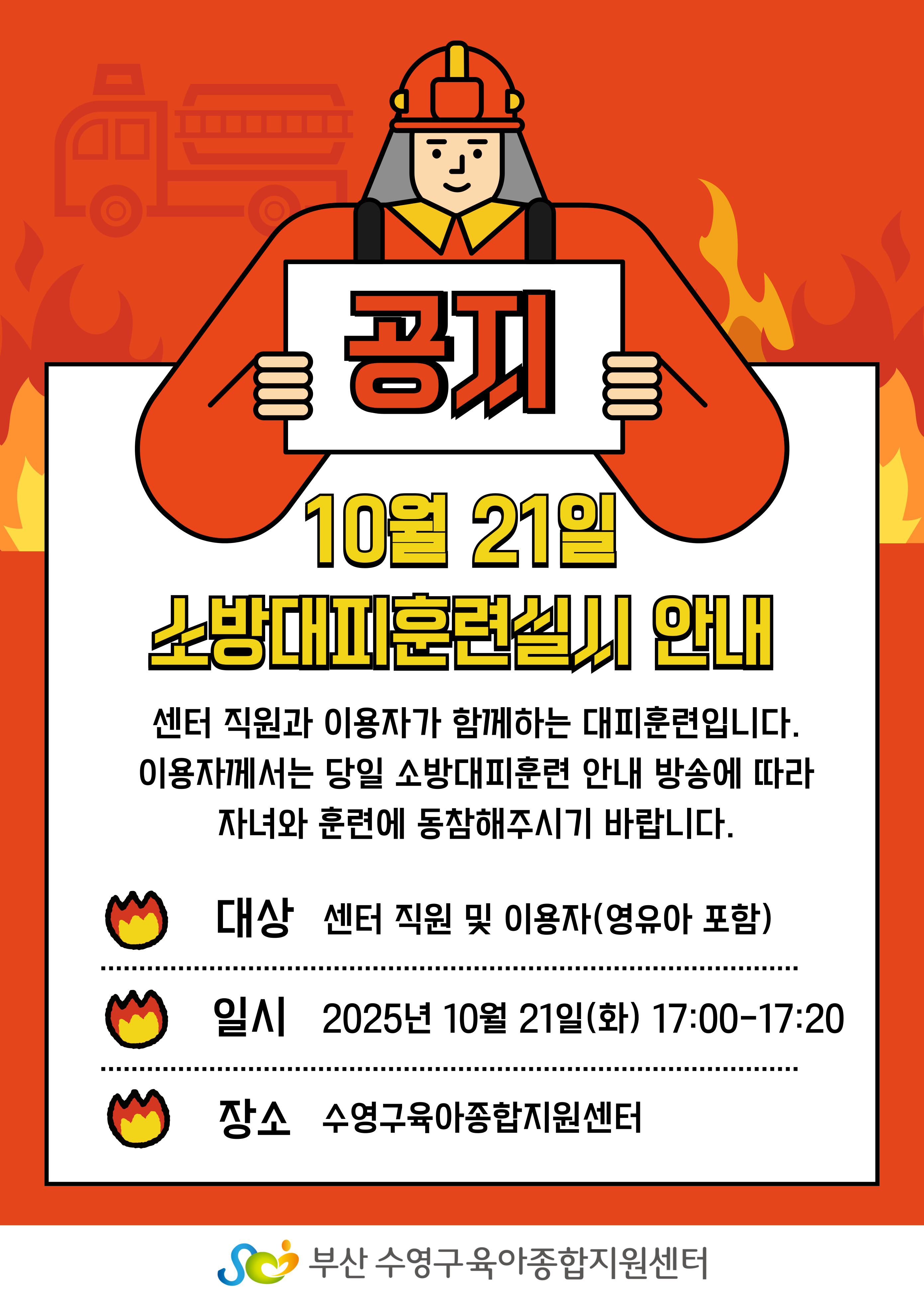 | ¼ö¿µ±¸À°¾ÆÁ¾ÇÕÁö¿ø¼¾ÅÍ ¼Ò¹æ´ëÇÇÈÆ·Ã ½Ç½Ã ¾È³» | |||||