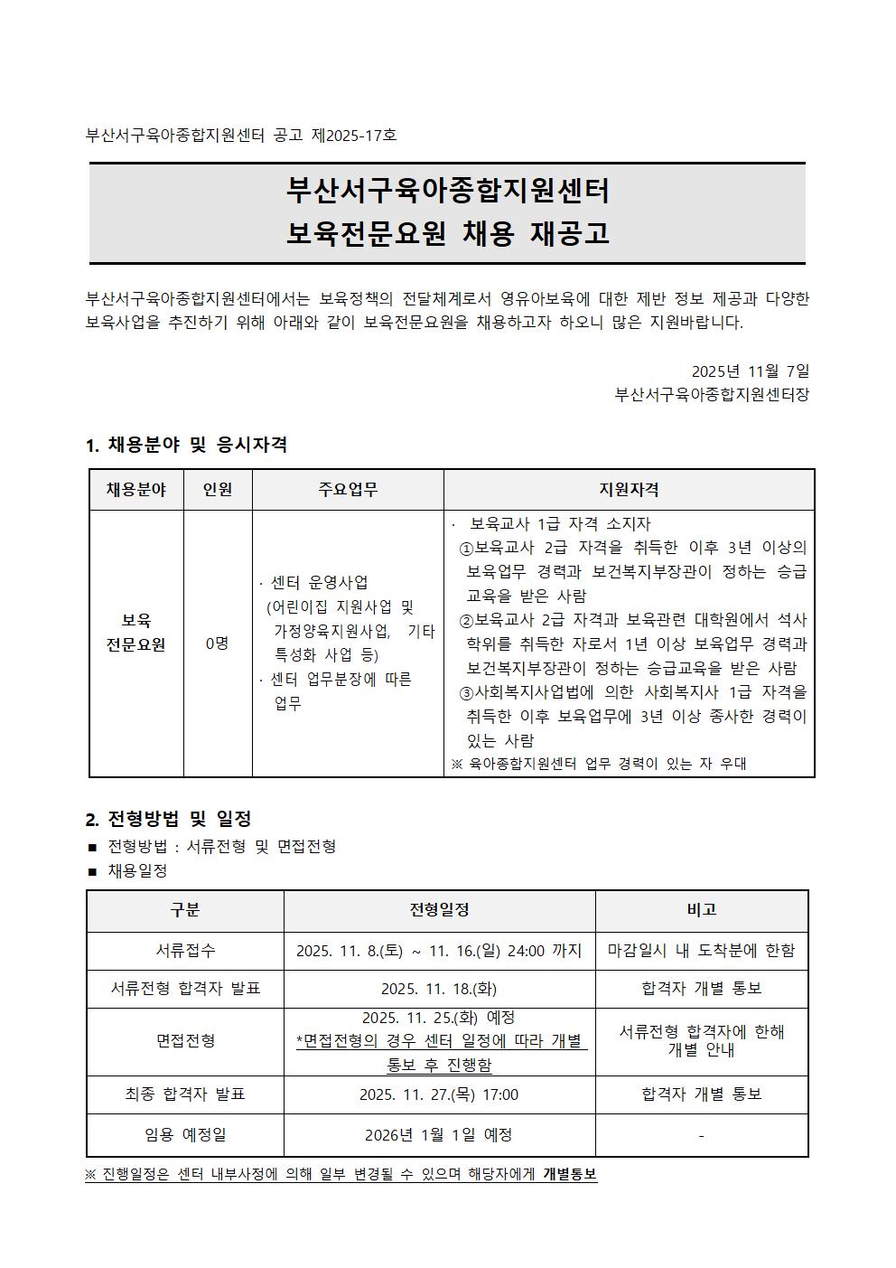 [ºÎ»ê¼±¸À°¾ÆÁ¾ÇÕÁö¿ø¼¾ÅÍ] Á÷¿ø(º¸À°Àü¹®¿ä¿ø) ä¿ë Àç°ø°í