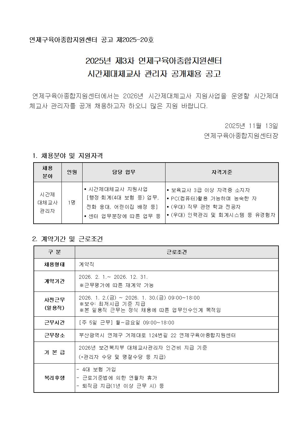 [¿¬Á¦±¸À°¾ÆÁ¾ÇÕÁö¿ø¼¾ÅÍ] 2025³â Á¦3Â÷ ½Ã°£Á¦´ëü±³»ç °ü¸®ÀÚ °ø°³Ã¤¿ë °ø°í
