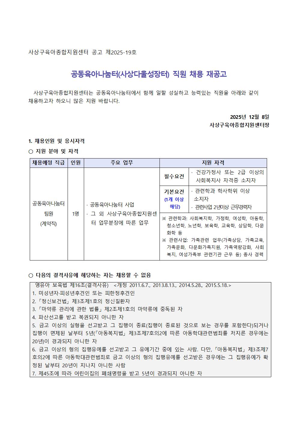 [»ç»ó±¸À°¾ÆÁ¾ÇÕÁö¿ø¼¾ÅÍ] °øµ¿À°¾Æ³ª´®ÅÍ Á÷¿ø ä¿ë Àç°ø°í