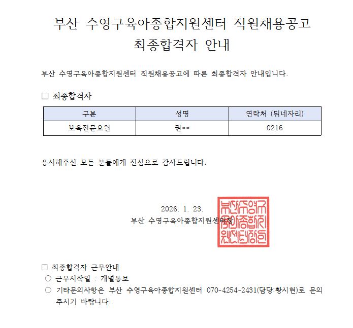 ¼ö¿µ±¸À°¾ÆÁ¾ÇÕÁö¿ø¼¾ÅÍ Á÷¿ø(º¸À°Àü¹®¿ä¿ø) ä¿ë ÃÖÁ¾ÇÕ°ÝÀÚ ¾È³»