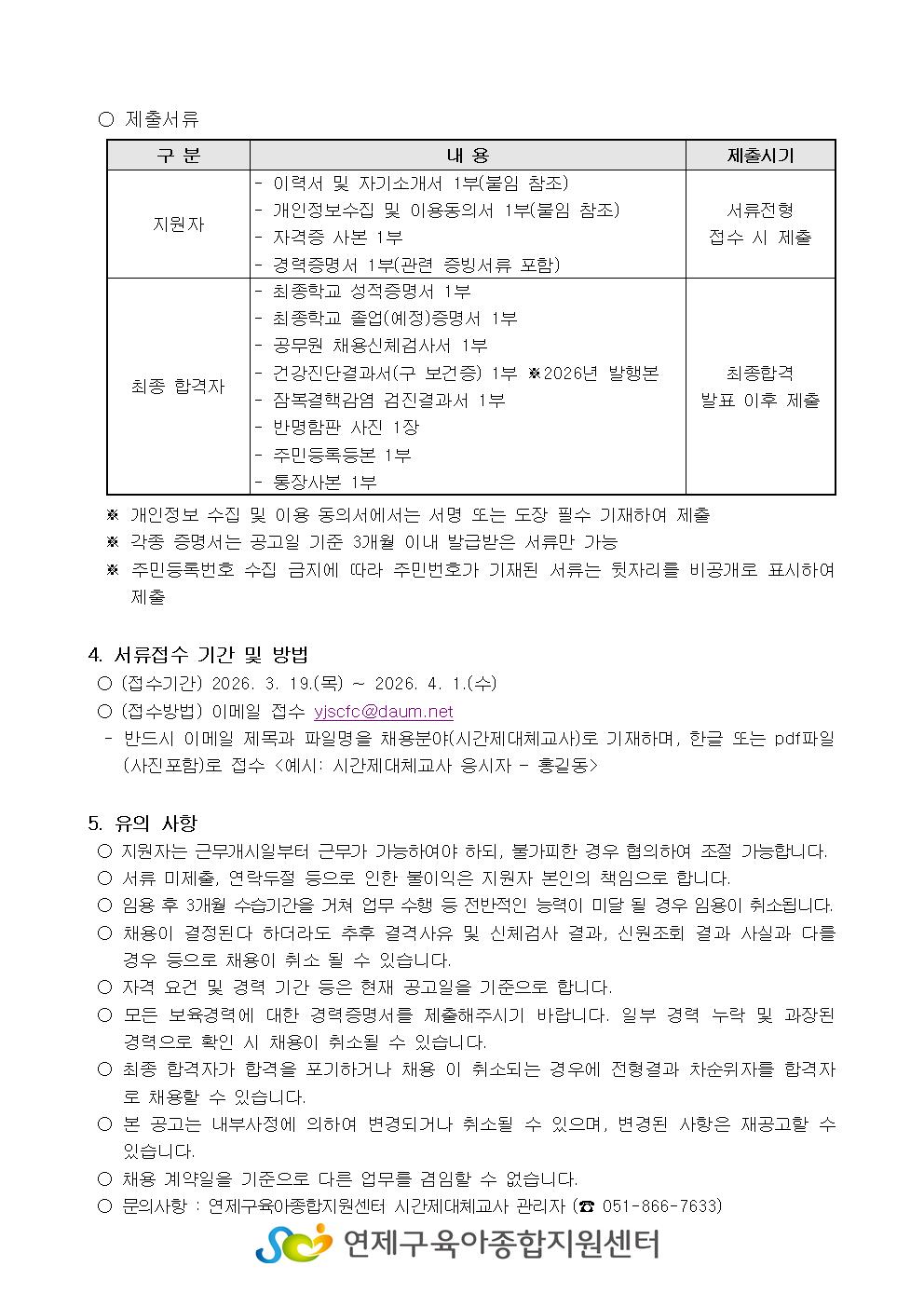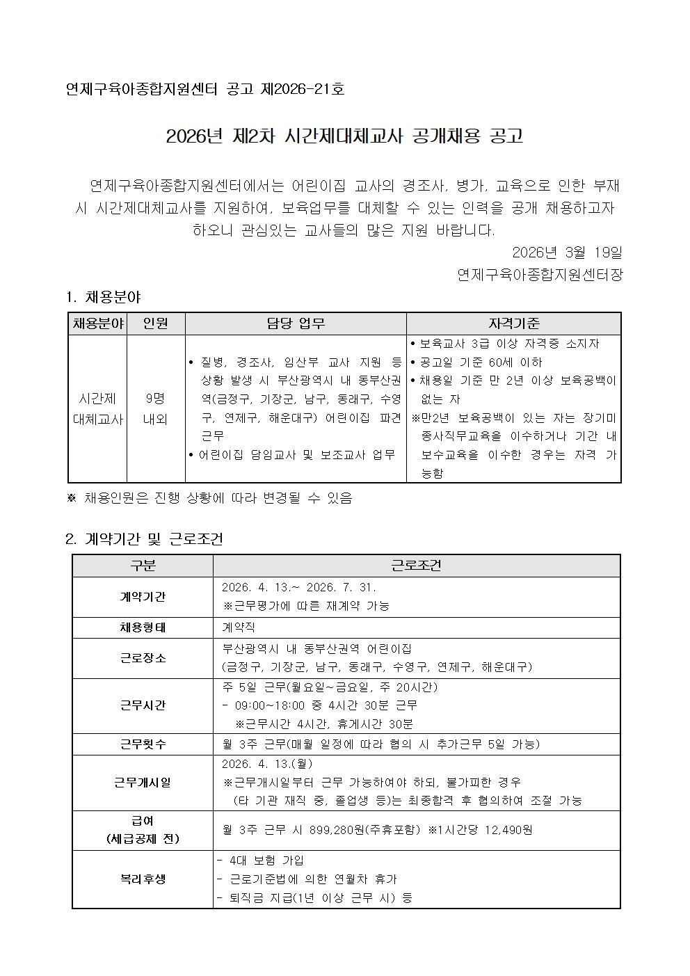 [¿¬Á¦±¸À°¾ÆÁ¾ÇÕÁö¿ø¼¾ÅÍ] 2026³â Á¦2Â÷ ½Ã°£Á¦´ëü±³»ç °ø°³Ã¤¿ë °ø°í