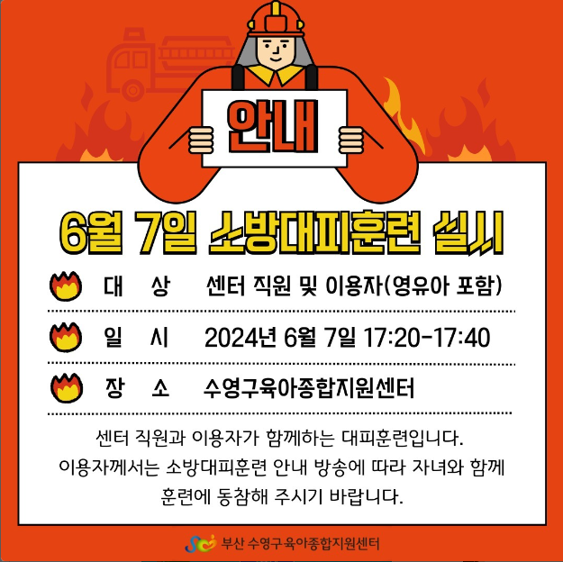 | ¼ö¿µ±¸À°¾ÆÁ¾ÇÕÁö¿ø¼¾ÅÍ ¼Ò¹æ´ëÇÇÈÆ·Ã ½Ç½Ã ¾È³» | |||||