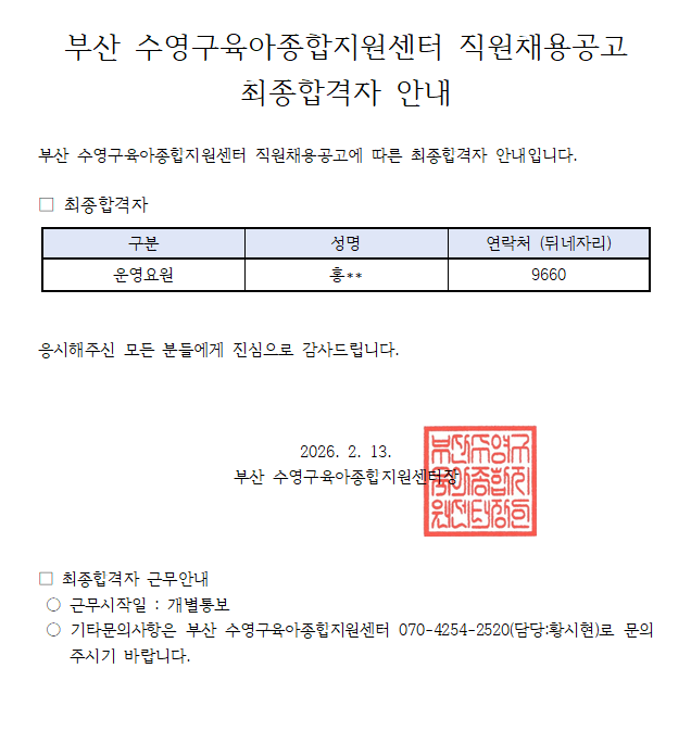 ¼ö¿µ±¸À°¾ÆÁ¾ÇÕÁö¿ø¼¾ÅÍ Á÷¿ø(ºÐ¼Ò ¿î¿µ¿ä¿ø) ä¿ë ÃÖÁ¾ÇÕ°ÝÀÚ ¹ßÇ¥