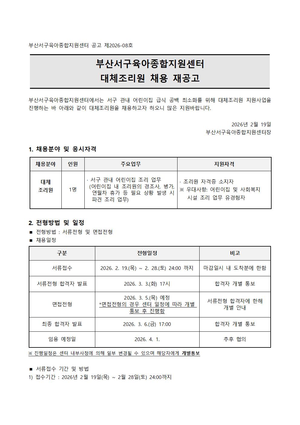 [ºÎ»ê¼±¸À°¾ÆÁ¾ÇÕÁö¿ø¼¾ÅÍ] ´ëüÁ¶¸®¿ø ä¿ë Àç°ø°í