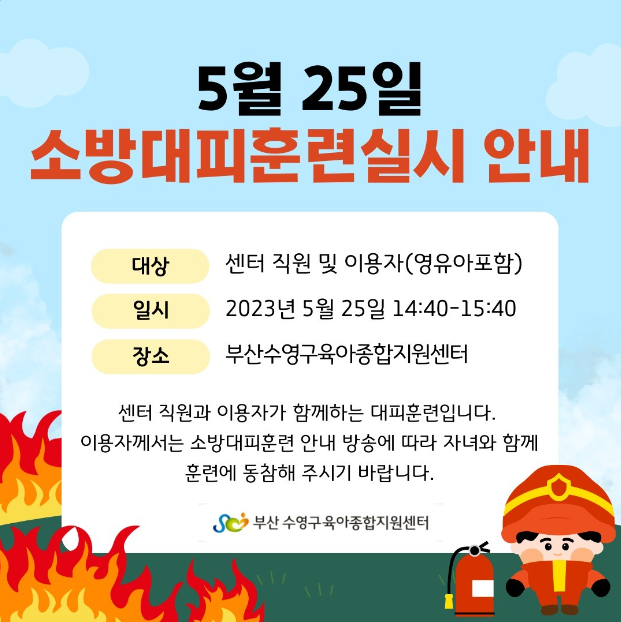 | ¼ö¿µ±¸À°¾ÆÁ¾ÇÕÁö¿ø¼¾ÅÍ ¼Ò¹æ´ëÇÇÈÆ·Ã ½Ç½Ã ¾È³» | |||||