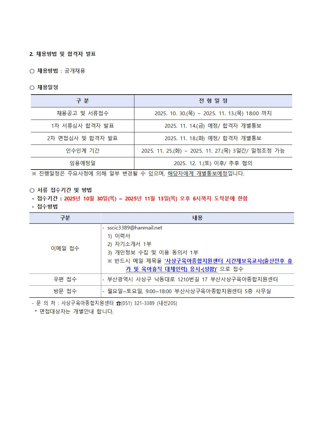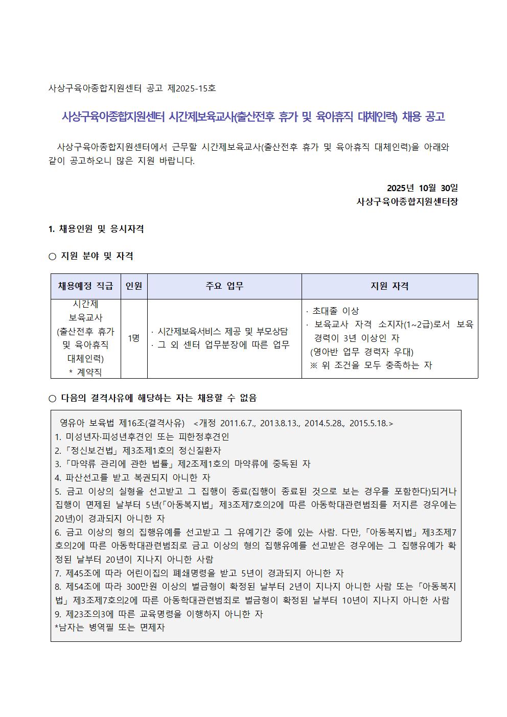 [»ç»ó±¸À°¾ÆÁ¾ÇÕÁö¿ø¼¾ÅÍ] ½Ã°£Á¦º¸À°±³»ç(Ãâ»êÀüÈÄ ÈÞ°¡ ¹× À°¾ÆÈÞÁ÷ ´ëüÀηÂ) ä¿ë °ø°í