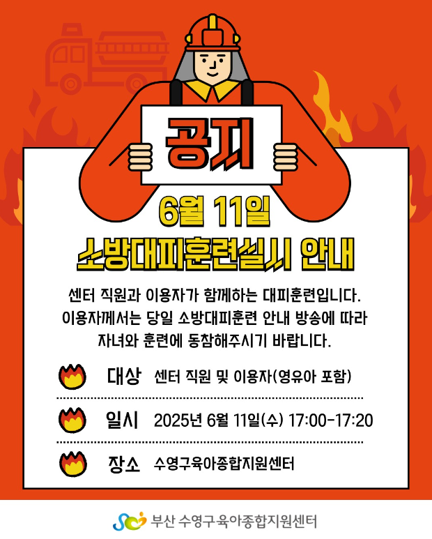 - ´ë»ó : ¼¾ÅÍ Á÷¿ø ¹× ÀÌ¿ëÀÚ(¿µÀ¯¾ÆÆ÷ÇÔ) - ÀϽà : 2025³â 6¿ù 11ÀÏ 17½Ã - Àå¼Ò : ºÎ»ê¼ö¿µ±¸À°¾ÆÁ¾ÇÕÁö¿ø¼¾ÅÍ ºñ»ó½Ã ¾ÆÀ̵é°ú ºÎ¸ð´ÔµéÀÇ ¾ÈÀüÀ» Áö۱â À§ÇÑ ÈÆ·ÃÀ̹ǷΠ¾È³» ¹æ¼Û¿¡ µû¶ó ÀÚ³à¿Í ÇÔ²² ÈÆ·Ã¿¡ µ¿ÂüÇØÁֽñ⠹ٶø´Ï´Ù |