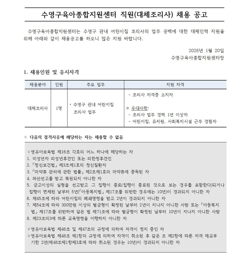 [°ø°í] ¼ö¿µ±¸ À°¾ÆÁ¾ÇÕÁö¿ø¼¾ÅÍ Á÷¿ø(´ëüÁ¶¸®»ç) ä¿ë