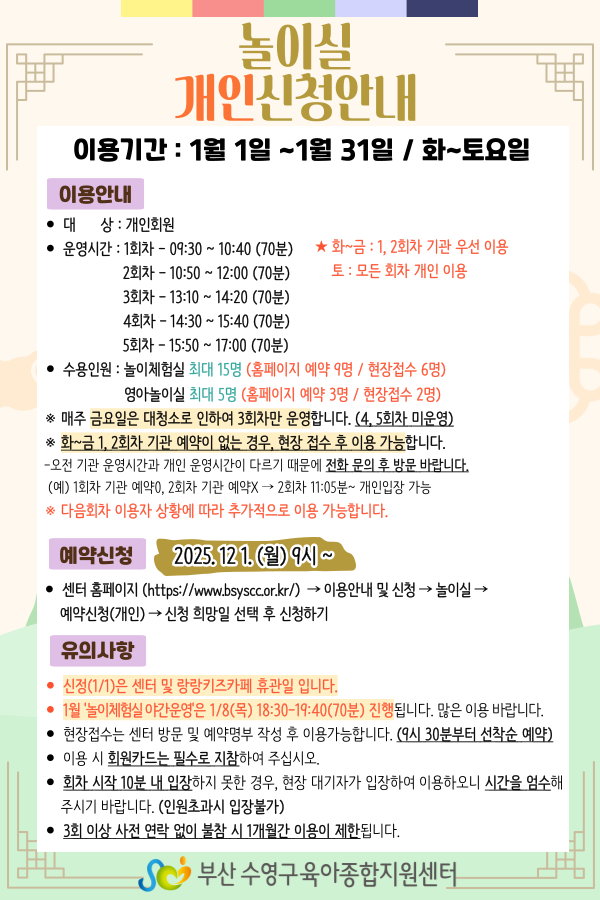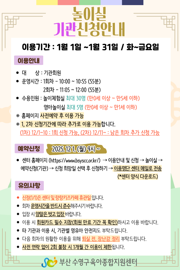 | [¼ö¿µ±¸À°¾ÆÁ¾ÇÕÁö¿ø¼¾ÅÍ] 2026³â 1¿ù ³îÀÌ½Ç ÀÌ¿ë¾È³» | |||||