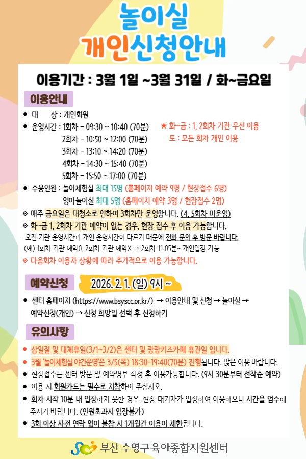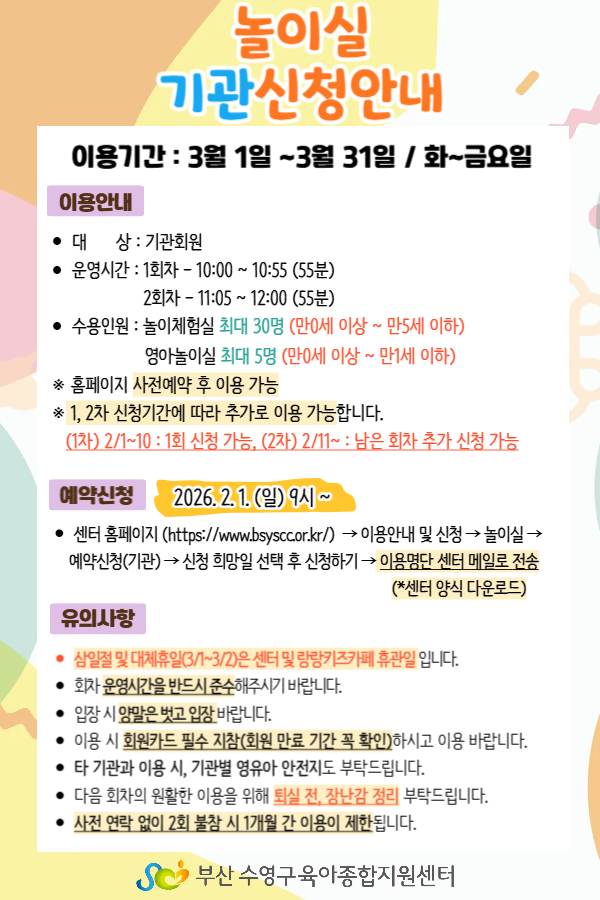 | [¼ö¿µ±¸À°¾ÆÁ¾ÇÕÁö¿ø¼¾ÅÍ] 2026³â 3¿ù ³îÀÌ½Ç ÀÌ¿ë¾È³» | |||||