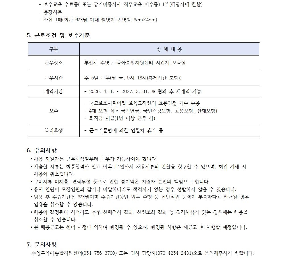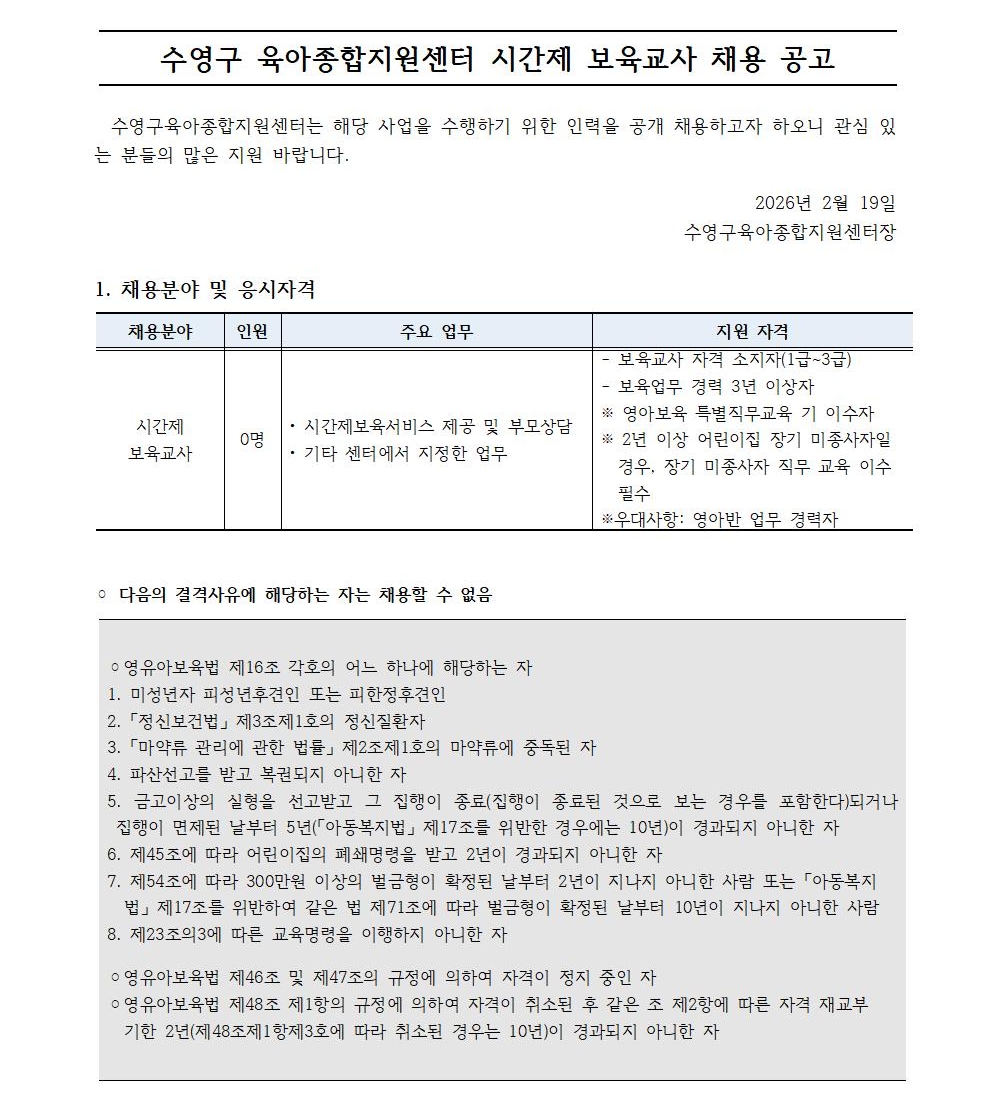 [°ø°í] ¼ö¿µ±¸À°¾ÆÁ¾ÇÕÁö¿ø¼¾ÅÍ Á÷¿ø(½Ã°£Á¦º¸À°±³»ç) ä¿ë °ø°í