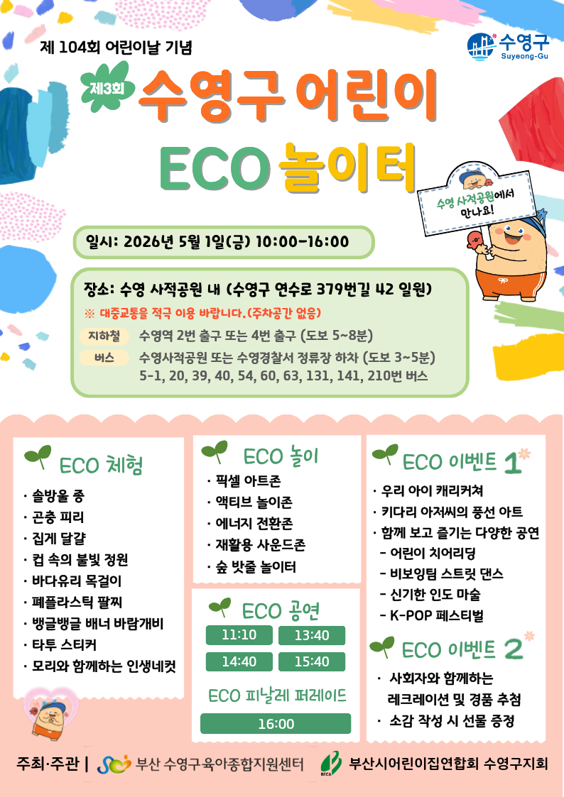 📢 ¼ö¿µ±¸À°¾ÆÁ¾ÇÕÁö¿ø¼¾ÅÍ¿Í ¼ö¿µ±¸¾î¸°ÀÌÁý¿¬ÇÕȸ°¡ ÇÔ²² ÁغñÇÑ Áñ°Ì°í ½Å³ª´Â ¾î¸°À̳¯!! ¾î¸°À̳¯À» ¸ÂÀÌÇÏ¿© 5¿ù 1ÀÏ ±Ý¿äÀÏ 'Á¦3ȸ ¼ö¿µ±¸ ¾î¸°ÀÌ ECO ³îÀÌÅÍ'¸¦ °³ÃÖÇÕ´Ï´Ù! ´Ù¾çÇÑ ECO üÇè, ECO ³îÀÌ, ECO °ø¿¬ ECO ÆÛ·¹À̵å, ECO À̺¥Æ®±îÁö!!! 🎉 ´õ¿í dz¼ºÇϰí!! ´õ¿í Áñ°Å¿öÁø!! "¼ö¿µ±¸ ¾î¸°ÀÌ ECO ³îÀÌÅÍ" ¸ðµÎ ÇÔ²²ÇÒ ÁغñµÇ¼Ì³ª¿ä?? 👉¾ð Á¦? 2026³â 5¿ù 1ÀÏ ±Ý¿äÀÏ 10½Ã~16½Ã 👉¾îµð¼? ¼ö¿µ »çÀû°ø¿ø ³» (¼ö¿µ±¸ ¿¬¼ö·Î 379¹ø±æ 42ÀÏ¿ø) ¡Ø ÀÛ³â°ú ´Þ¸® Àå¼Ò°¡ º¯°æµÇ¾ú½À´Ï´Ù!! ¼ö¿µ»çÀû°ø¿ø¿¡¼ ¸¸³ª¿ä🙌 ![]() |