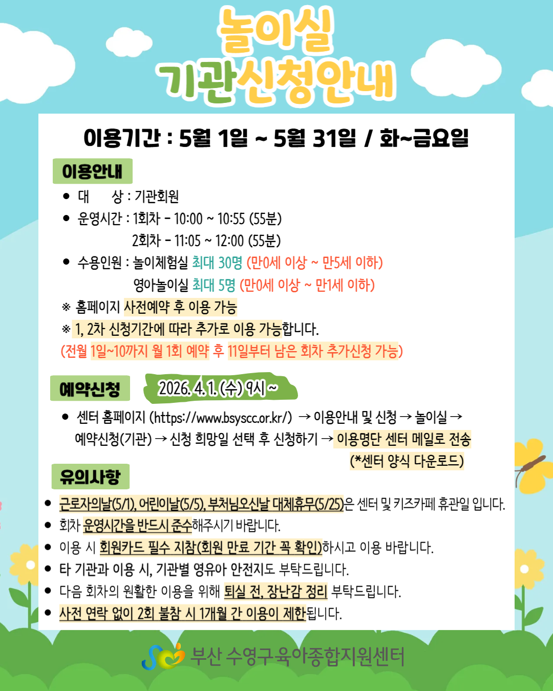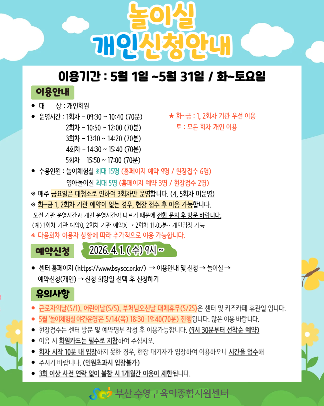 | [¼ö¿µ±¸À°¾ÆÁ¾ÇÕÁö¿ø¼¾ÅÍ] 2026³â 5¿ù ³îÀÌ½Ç ÀÌ¿ë¾È³» | |||||