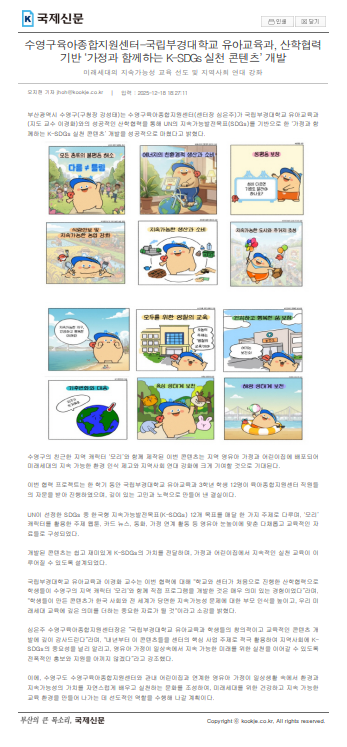 [±¹Á¦½Å¹®] ¼ö¿µ±¸À°¾ÆÁ¾ÇÕÁö¿ø¼¾ÅÍ-±¹¸³ºÎ°æ´ëÇб³ À¯¾Æ±³À°°ú, »êÇÐÇù·Â±â¹Ý ¡®°¡Á¤°ú ÇÔ²²ÇÏ´Â K-SDGs ½Çõ ÄÜÅÙÃ÷¡¯ °³¹ß