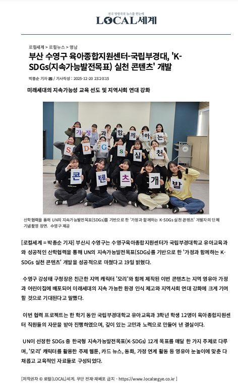 [·ÎÄü¼°è] ºÎ»ê ¼ö¿µ±¸ À°¾ÆÁ¾ÇÕÁö¿ø¼¾ÅÍ-±¹¸³ºÎ°æ´ë, 'K-SDGs(Áö¼Ó°¡´É¹ßÀü¸ñÇ¥) ½Çõ ÄÜÅÙÃ÷' °³¹ß