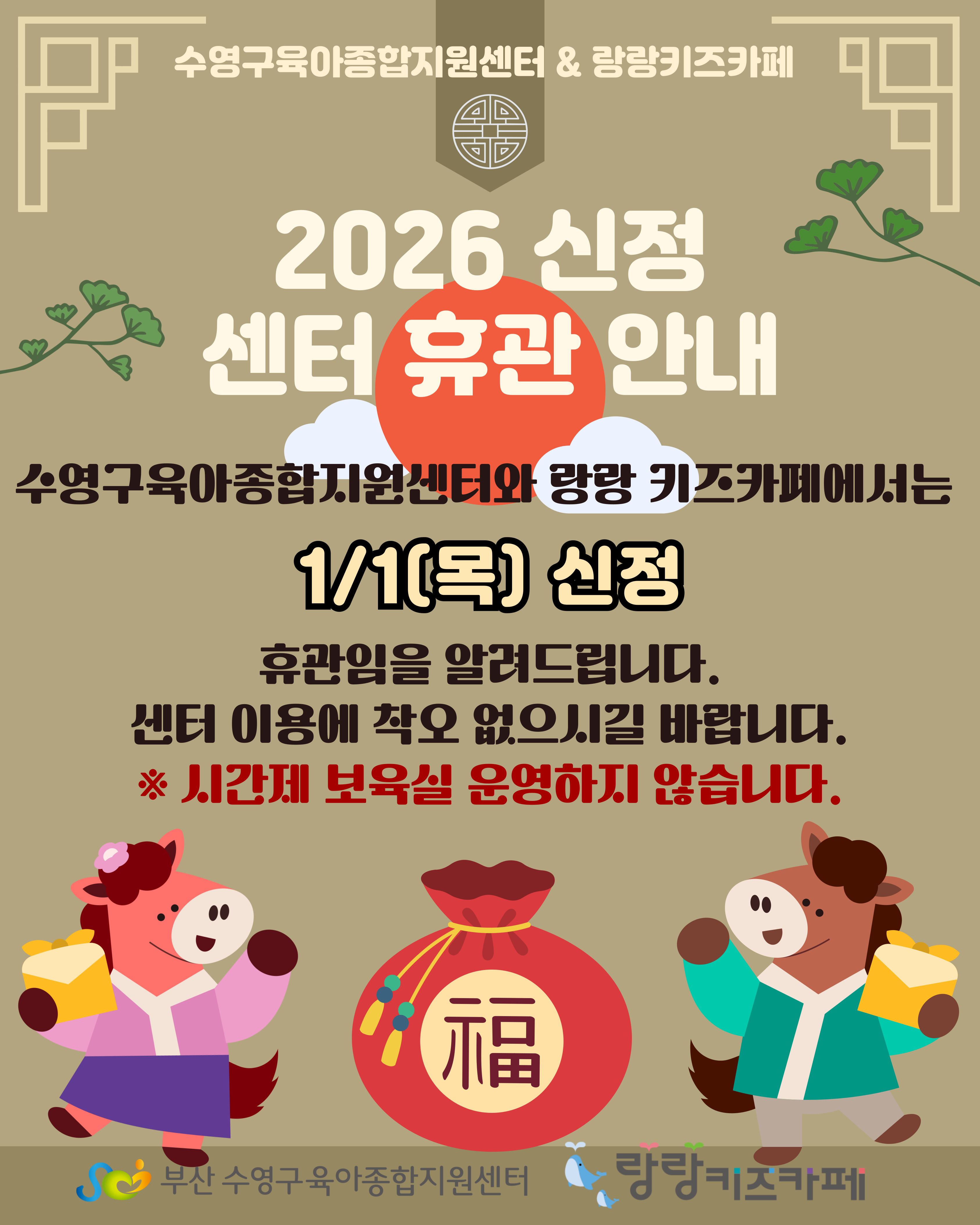 | [¼ö¿µ±¸À°¾ÆÁ¾ÇÕÁö¿ø¼¾ÅÍ&¶û¶û ŰÁîÄ«Æä] 1¿ù ½ÅÁ¤ ÈÞ°ü¾È³» | |||||