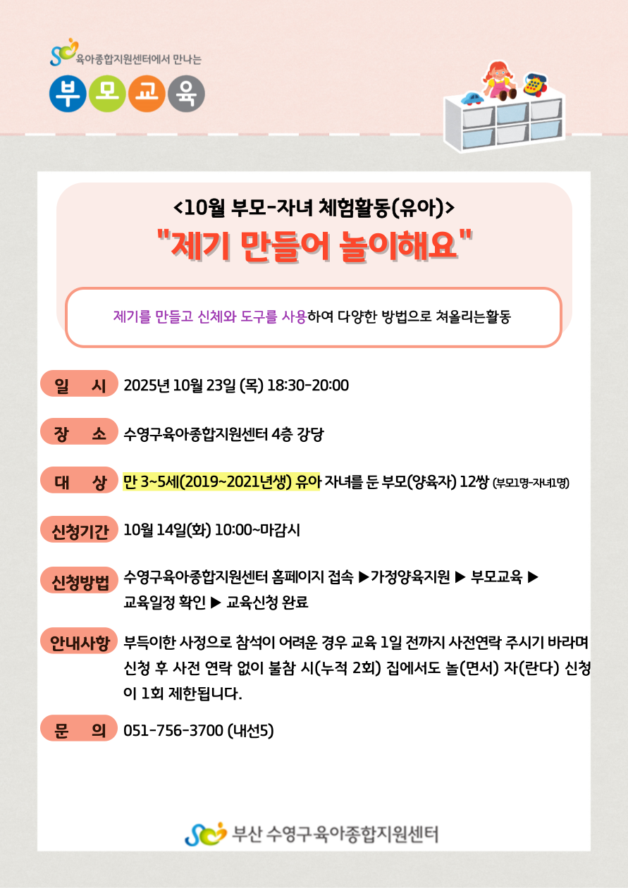 ºÎ¸ð-ÀÚ³à üÇèȰµ¿(À¯¾Æ) 'Á¦±â ¸¸µé¾î ³îÀÌÇØ¿ä' | |||