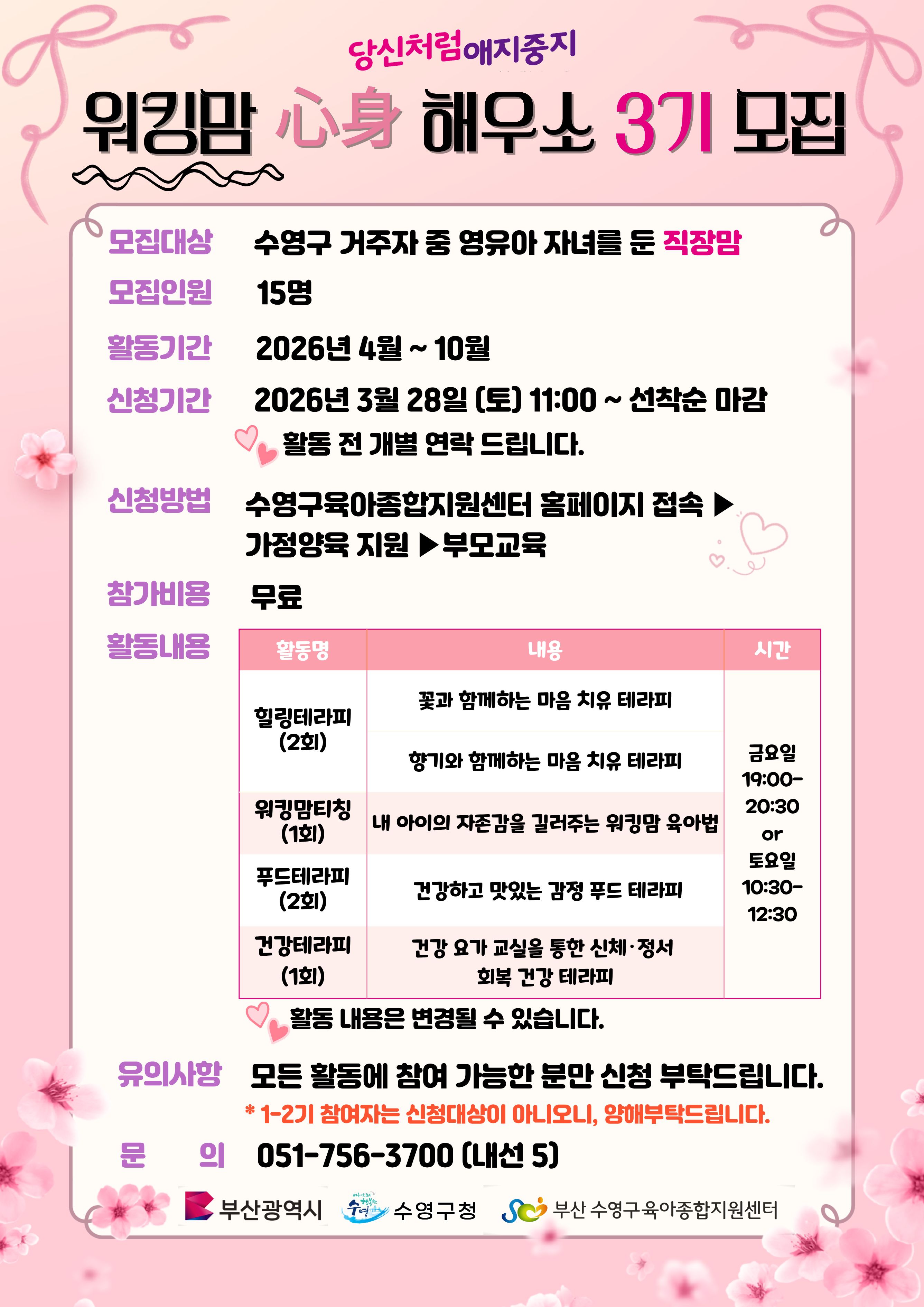 | ±âŸ»çÇ× | * ¿öÅ·¸¾ ãýãó ÇØ¿ì¼Ò´Â ¼ö¿µ±¸ °ü³» ¿µÀ¯¾Æ Àڳฦ µÐ Á÷À帾À» À§ÇÑ ÇÁ·Î±×·¥ÀÔ´Ï´Ù. * º» ÇÁ·Î±×·¥Àº ¼±Âø¼ø ¸ðÁýÀÌ¿À´Ï Âü°í ¹Ù¶ø´Ï´Ù. * ±¸Ã¼ÀûÀÎ ÀÏÁ¤Àº ¼±Á¤ ÀÌÈÄ ¾Ë·Áµå¸± ¿¹Á¤ÀÌ¿À´Ï Âü°í ¹Ù¶ø´Ï´Ù. * Ȱµ¿³»¿ëÀº º¯°æµÉ ¼ö ÀÖ½À´Ï´Ù. * ±³À° ½Åû ³¯Â¥´Â ȨÆäÀÌÁö ¼±Âø¼ø ½ÅûÀ» À§ÇÑ °ÍÀ̹ǷΠÂü°í¹Ù¶ø´Ï´Ù. |