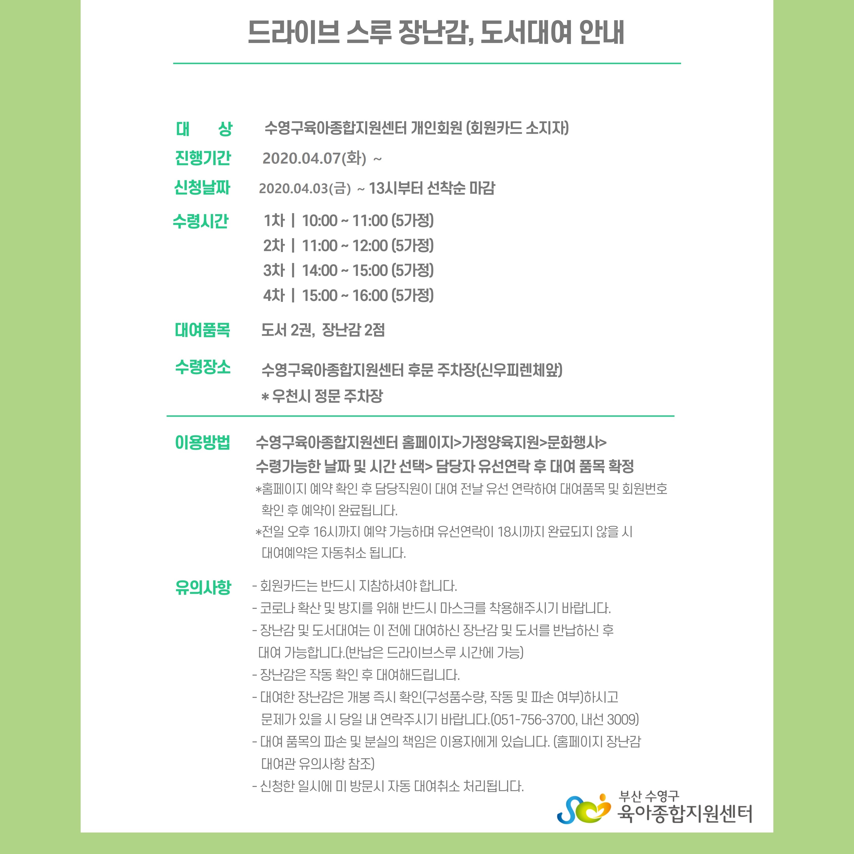 | À¯ÀÇ»çÇ× | - ȸ¿øÄ«µå´Â ¹Ýµå½Ã ÁöÂüÇÏ¼Å¾ß ÇÕ´Ï´Ù. - º» »ç¾÷Àº ¼¾ÅÍ È¸¿øÀÎ ºÎ¸ð-Àڳฦ ´ë»óÀ¸·Î ÁøÇàµÇ´Â °¡Á¤¾çÀ°Áö¿ø»ç¾÷À¸·Î ȸ¿øÄ«µå°¡ ÀÖ´Â °³ÀÎȸ¿ø¿¡ ÇÑÇØ ÁøÇàµË´Ï´Ù. - ¼±Âø¼ø ½Åû ÈÄ¿¡´Â Ãë¼Ò°¡ ºÒ°¡ÇÏ¿À´Ï Âü¿© °¡´ÉÇÑ °æ¿ì¿¡¸¸ ½ÅÃ»ÇØÁֽñ⠹ٶø´Ï´Ù. - Àå³°¨(´ëÇü Àå³°¨ Á¦¿Ü) ¹× µµ¼ ´ë¿©´Â ÀÌ Àü¿¡ ´ë¿©ÇϽŠÀå³°¨ ¹× µµ¼¸¦ ¹Ý³³ÇϽŠÈÄ ´ë¿© °¡´ÉÇÕ´Ï´Ù.(¹Ý³³Àº µå¶óÀ̺꽺·ç ½Ã°£¿¡ °¡´É) - ½ÅûÇÑ ÀϽÿ¡ ¹Ì ¹æ¹®½Ã ÀÚµ¿ ´ë¿©Ãë¼Ò 󸮵˴ϴÙ. |
