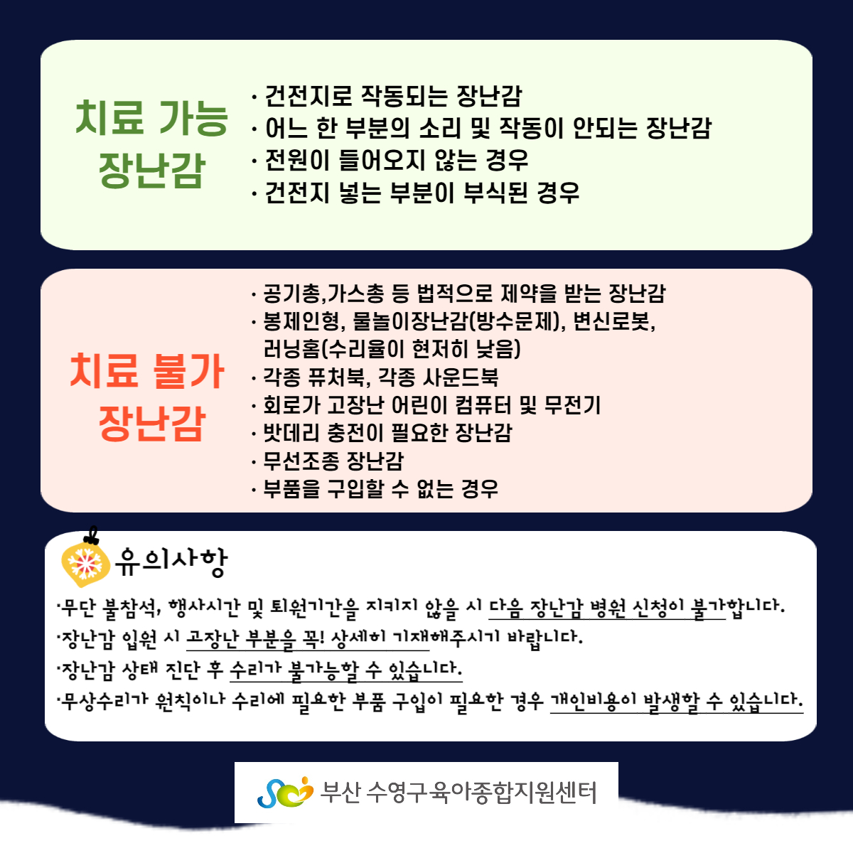 | À¯ÀÇ»çÇ× | ** ¼ö¸®ÇÏ½Ç Àå³°¨ ¸í °Ë»öÇϰųª, ±âÀÔÇÏÁö ¾ÊÀ¸¼Åµµ µË´Ï´Ù** - ¹«´Ü ºÒ Âü¼®, Çà»ç ½Ã°£ ¹× Åð¿ø ±â°£À» ÁöŰÁö ¾ÊÀ» ½Ã ´ÙÀ½ Àå³°¨ º´¿ø ½ÅûÀÌ ºÒ°¡ÇÕ´Ï´Ù. - ½ÅûÇϽŠÁø·á ½Ã°£À» ¹Ýµå½Ã È®ÀÎÇϽðí, ½ÅûÇϽŠÁø·á ½Ã°£ ³» ¹æ¹®ÇØÁֽñ⠹ٶø´Ï´Ù. - ȸ¿ø Ä«µå´Â ¹Ýµå½Ã ÁöÂüÇÏ¼Å¾ß ÇÕ´Ï´Ù. - Àå³°¨ Áø·á ½Ã °³ÀÎÁ¤º¸ ¼öÁý ¹× ÀÌ¿ë µ¿ÀǼ¿Í ½Åû¼¸¦ ÀÛ¼ºÇØÁÖ¼Å¾ß ÇÕ´Ï´Ù. - Àå³°¨ »óÅ Áø´Ü ÈÄ ¼ö¸®°¡ ºÒ°¡´ÉÇÒ ¼ö ÀÖ½À´Ï´Ù. - ¹«»ó ¼ö¸®°¡ ¿øÄ¢À̳ª ¼ö¸®¿¡ ÇÊ¿äÇÑ ºÎǰ ±¸ÀÔÀÌ ÇÊ¿äÇÑ °æ¿ì °³ÀÎ ºñ¿ëÀÌ ¹ß»ýÇÒ ¼ö ÀÖ½À´Ï´Ù. |