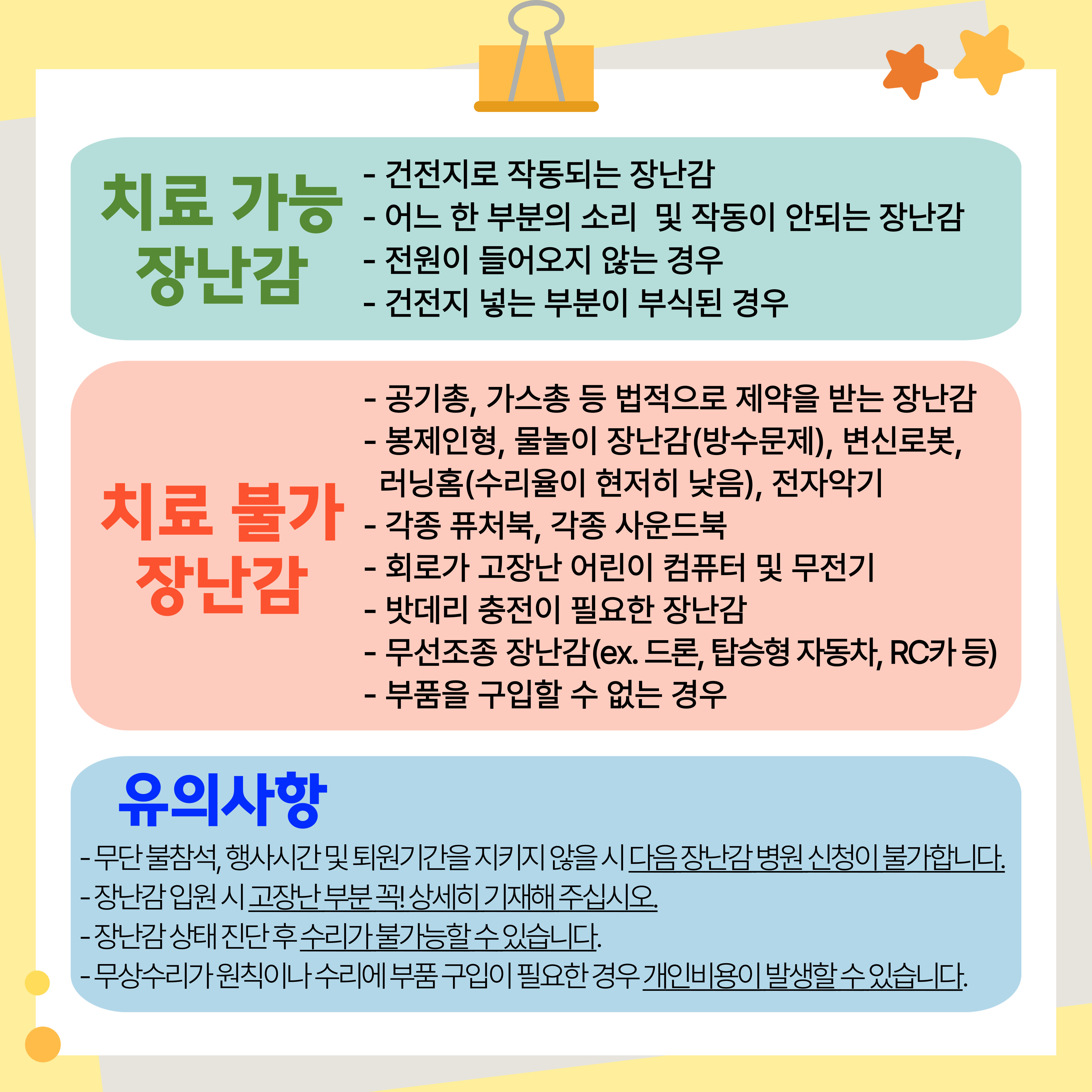 | À¯ÀÇ»çÇ× | - ¹«´Ü ºÒ Âü¼®, Çà»ç ½Ã°£ ¹× Åð¿ø ±â°£À» ÁöŰÁö ¾ÊÀ» ½Ã ´ÙÀ½ Àå³°¨ º´¿ø ½ÅûÀÌ ºÒ°¡ÇÕ´Ï´Ù. - Çà»ç Âü¿© ½Ã ȸ¿øÄ«µå¸¦ ¹Ýµå½Ã ÁöÂüÇÏ¼Å¾ß ÇÕ´Ï´Ù. - Àå³°¨ ºÐ½Ç ¹æÁö¸¦ À§ÇØ °³º°ºÀÅõ¿¡ ´ã¾Æ ¿À½Ã±æ ¹Ù¶ø´Ï´Ù. - Àå³°¨ Áø·á ½Ã °³ÀÎÁ¤º¸ ¼öÁý ¹× ÀÌ¿ë µ¿ÀǼ¿Í ½Åû¼¸¦ ÀÛ¼ºÇØÁÖ¼Å¾ß ÇÕ´Ï´Ù. - Àå³°¨ »óÅ Áø´Ü ÈÄ ¼ö¸®°¡ ºÒ°¡´ÉÇÒ ¼ö ÀÖ½À´Ï´Ù. - ¹«»ó¼ö¸®°¡ ¿øÄ¢À̳ª ¼ö¸®¿¡ ÇÊ¿äÇÑ ºÎǰ ±¸ÀÔÀÌ ÇÊ¿äÇÑ °æ¿ì °³Àκñ¿ëÀÌ ¹ß»ýÇÒ ¼ö ÀÖ½À´Ï´Ù. - ÀÔ¿øÁø·á ´ë»ó Àå³°¨Àº 6/5(¸ñ) ~ 6/19(¸ñ)±îÁö Àå³°¨ Ä¡·á ÈÄ Åð¿ø °¡´É ÇÕ´Ï´Ù. |