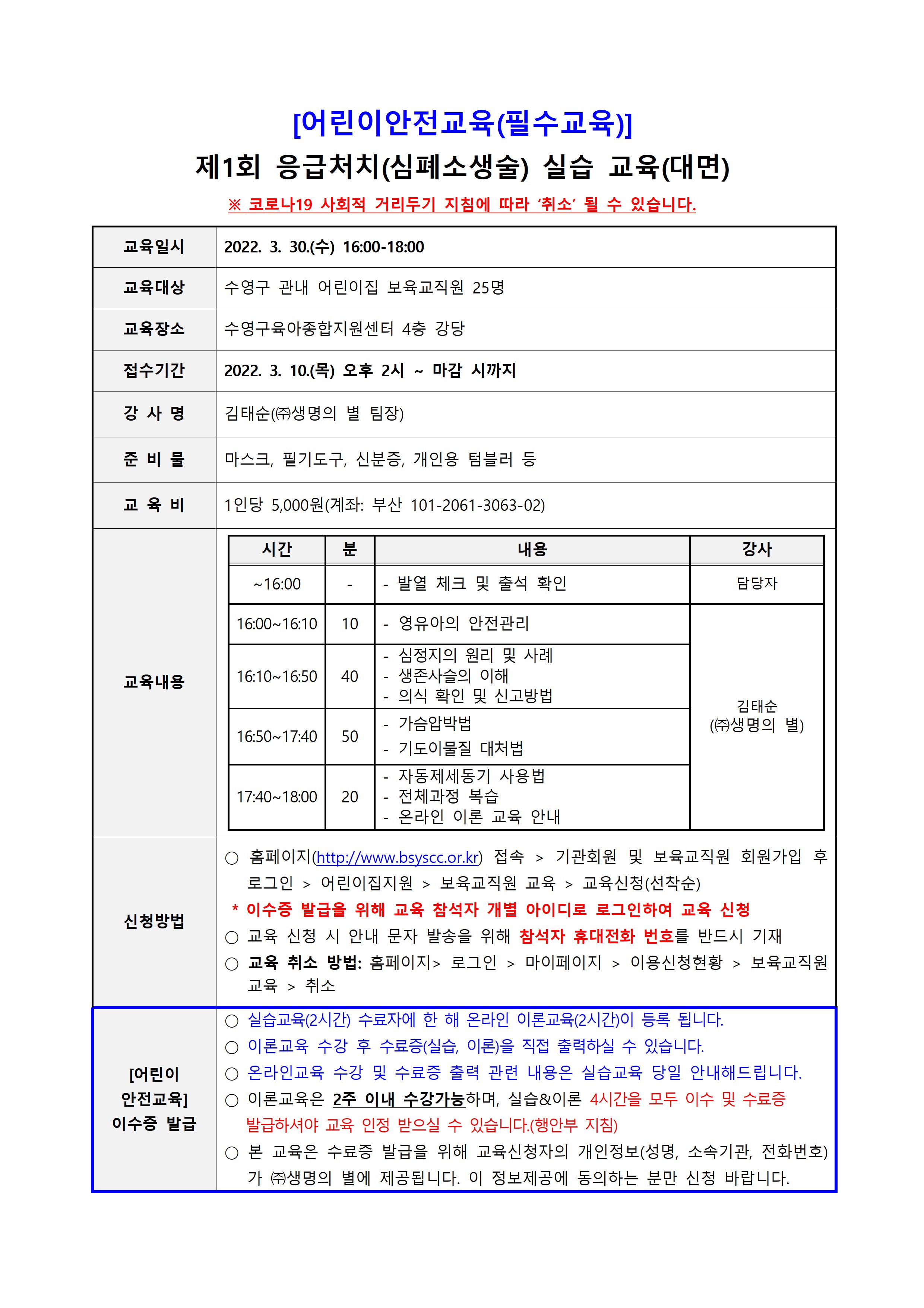 | [¾î¸°ÀÌ ¾ÈÀü±³À°] Á¦1ȸ ÀÀ±Þóġ(½ÉÆó¼Ò»ý¼ú) ½Ç½À ±³À°(¾î¸°À̾ÈÀü¹ý°ü·Ã Çʼö±³À°) | |||