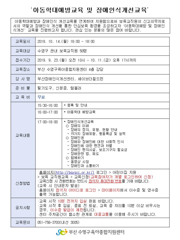 | ±âŸ»çÇ× | ¡à ±³À°½ÅûÀº ¼¾ÅÍ È¨ÆäÀÌÁö º¸À°±³Á÷¿øÀ¸·Î °¡ÀÔ ÈÄ ½Åû °¡´ÉÇϽʴϴÙ. ¡à ±³À°½Åû ½Ã ÀüȹøÈ£´Â ¹Ýµå½Ã Âü¼®ÀÚ ÈÞ´ëÆù ¹øÈ£¸¦ ±âÀç ¹Ù¶ø´Ï´Ù. - ±³À°ÁøÇà Àü¹Ý¿¡ ´ëÇÑ ¾È³»¸¦ SMS·Î Àü¼ÛÇÕ´Ï´Ù. ¡à ±³À°½ÃÀÛ 10ºÐÀü ±îÁö ÀÔ½Ç¿Ï·á ¹Ù¶ó¸ç, ±³À°½ÃÀÛ ÈÄ ÀԽǰú Á¾·á Àü Åð½ÇÇÑÀÚ, ±³À° Áß ÀÚ¸®¸¦ 10ºÐ ÀÌ»ó ºñ¿îÀÚ´Â À̼öÁõ ¹ß±ÞÀÌ Á¦Çѵ˴ϴÙ. ¡à ¿øÈ°ÇÑ ±³À°À» À§ÇØ ±³À°½ÃÀÛ ÀÌÈÄ¿¡´Â ÀÔÀåÀÌ Á¦Çѵ˴ϴÙ. ¡à ±³À° ½Ã ¿µÀ¯¾Æ µ¿¹ÝÀÌ µÇÁö ¾ÊÀ¸´Ï ¾çÇØ ºÎʵ右´Ï´Ù. ¡à ¼¾ÅÍ ÁÖÂ÷°ø°£ÀÌ Çù¼ÒÇÑ °ü°è·Î ´ëÁß±³ÅëÀ» ÀÌ¿ëÇØ ÁÖ½Ã±æ ¹Ù¶ø´Ï´Ù. ¡à ±³À°¹®ÀÇ: 051-756-3700 (³»¼±. 3005) |