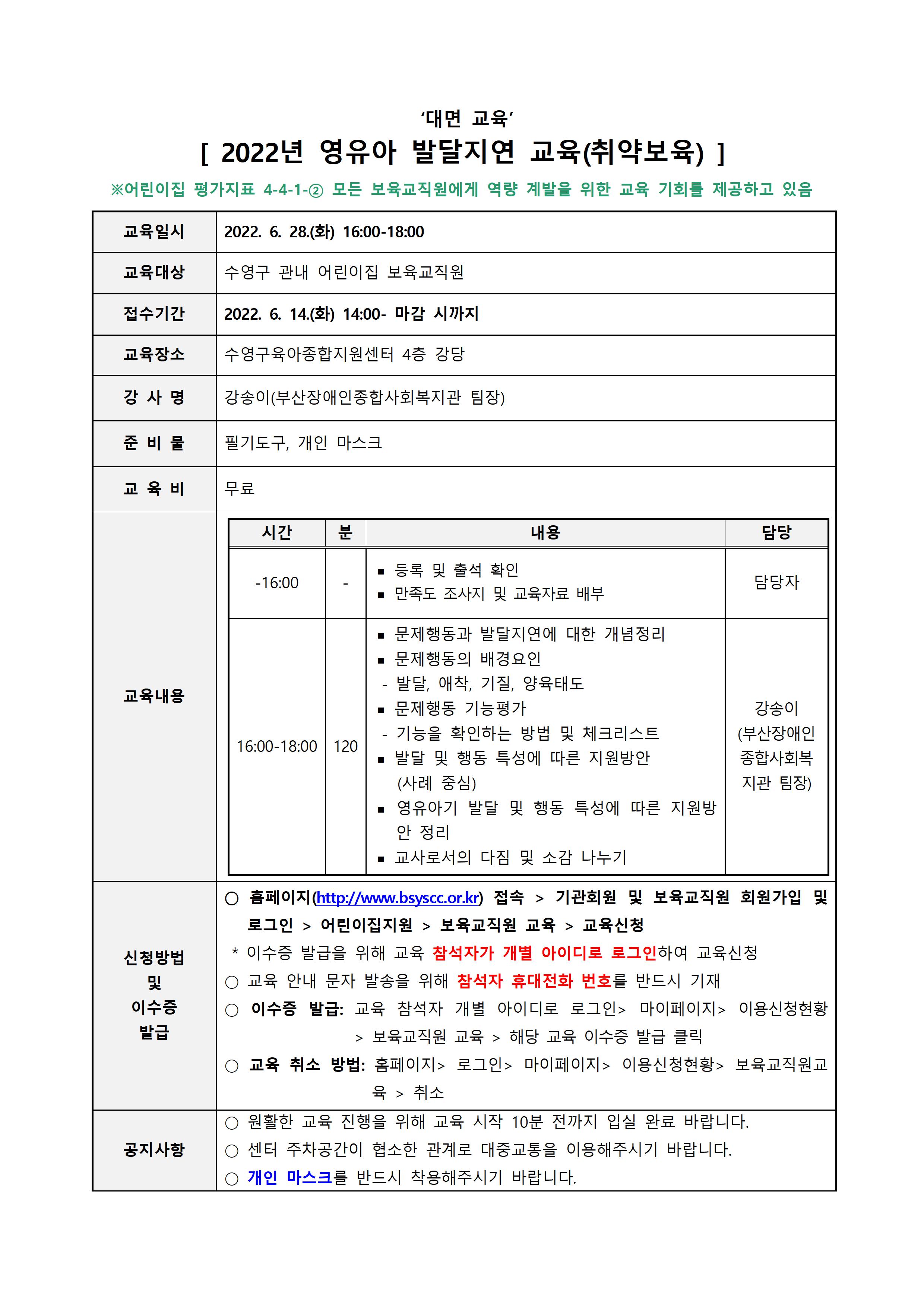 | ½Åû±â°£ | 2022-06-14(È) 14½Ã ~ ¸¶°¨ ½Ã±îÁö (¼ö¿µ±¸ °ü³» ¾î¸°ÀÌÁý º¸À°±³Á÷¿ø) | ||