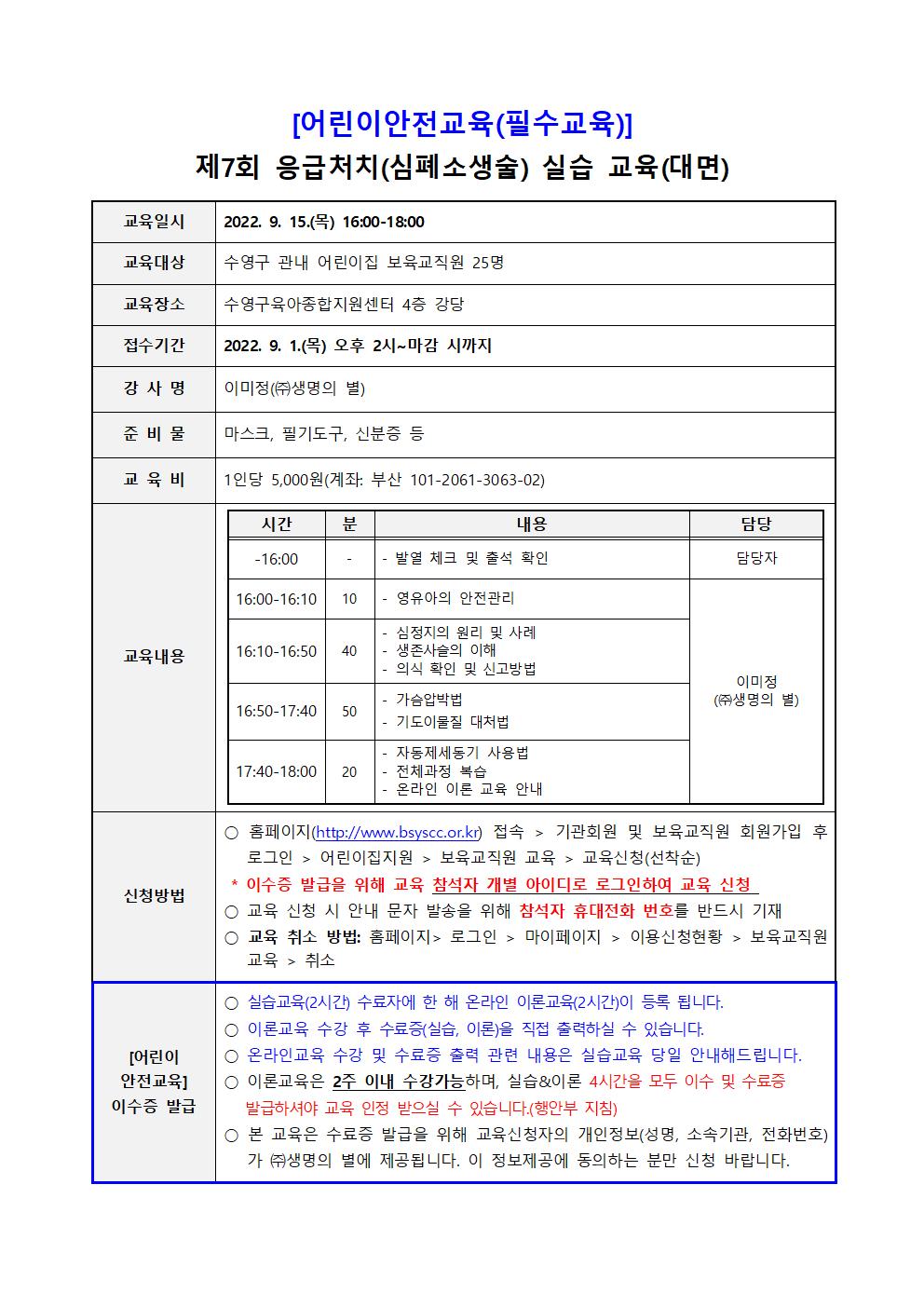 | [¾î¸°ÀÌ ¾ÈÀü±³À°] Á¦7ȸ ÀÀ±Þóġ(½ÉÆó¼Ò»ý¼ú) ½Ç½À ±³À°(¾î¸°À̾ÈÀü¹ý°ü·Ã Çʼö±³À°) | |||