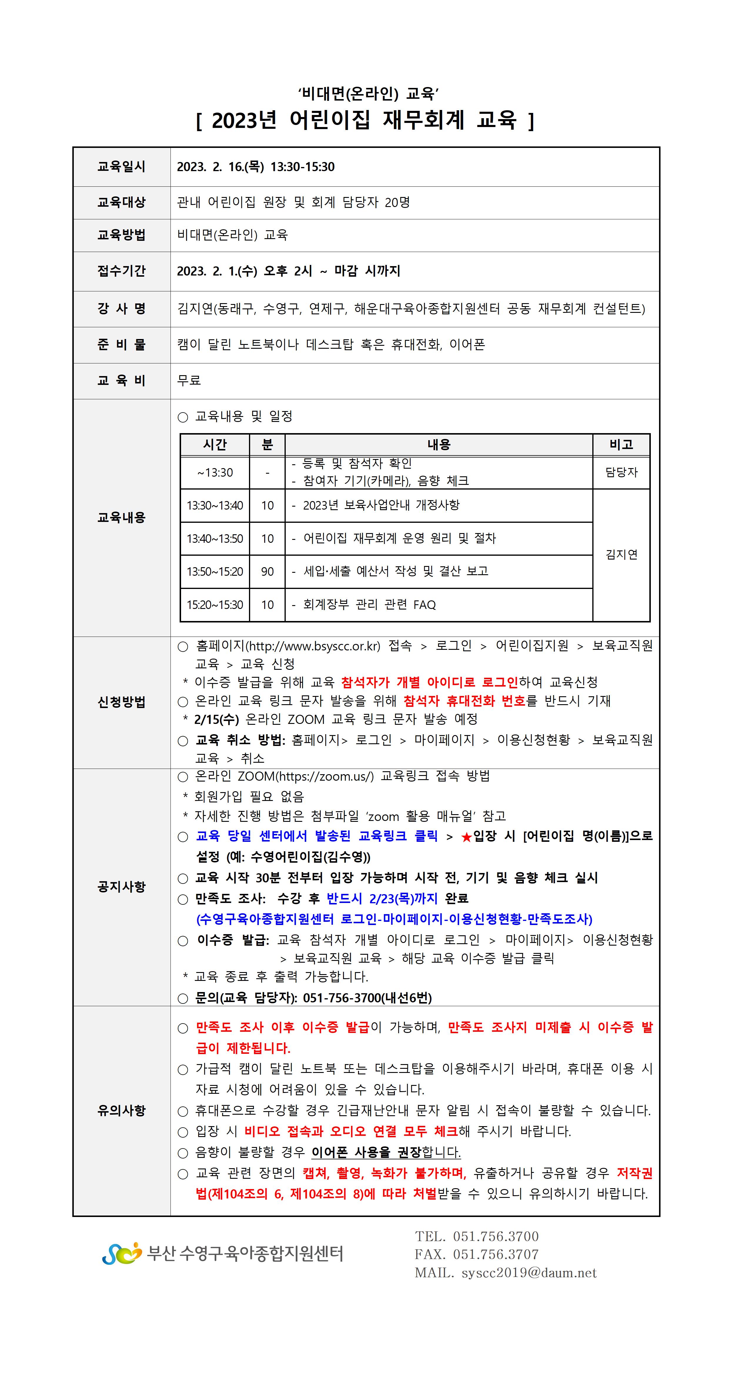 | Á¢¼ö´ë»ó | ¼ö¿µ±¸ °ü³» ¾î¸°ÀÌÁý ¿øÀå ¹× È¸°è´ã´çÀÚ | Á¤¿ø | 20¸í (½Åû: 30) |