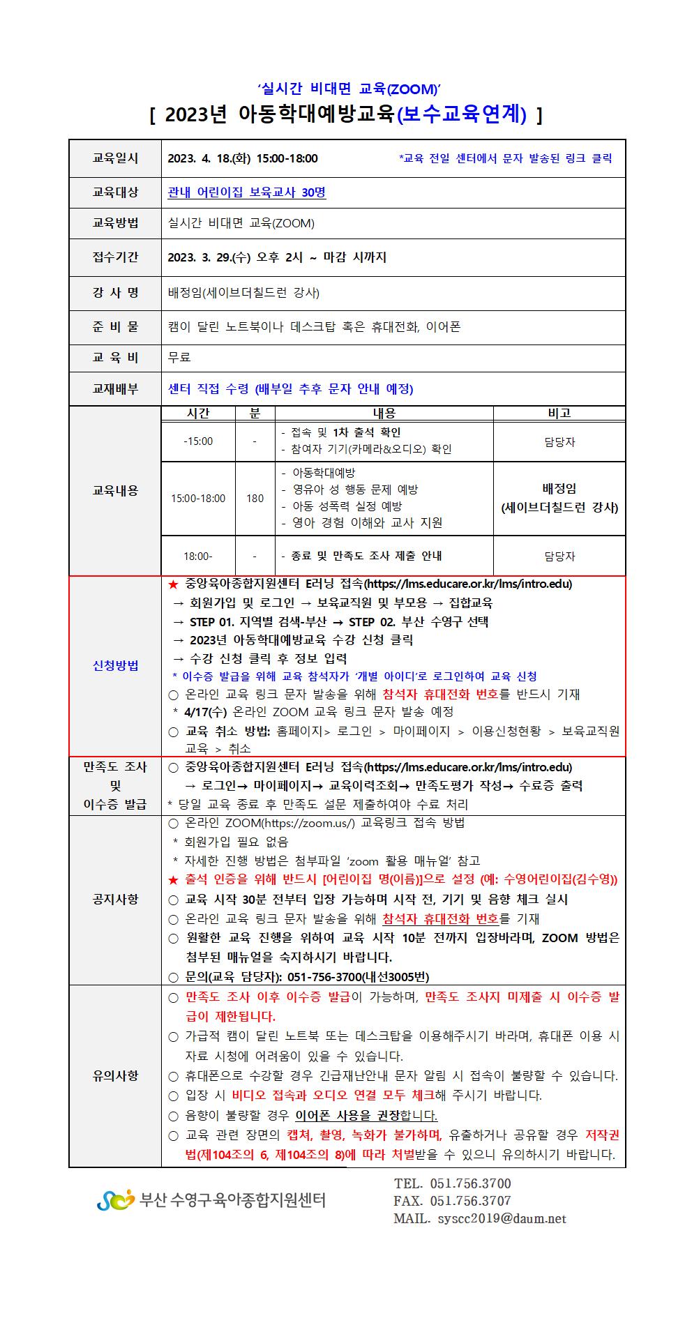 | ±âŸ»çÇ× | ¡Ú ½Åû¹æ¹ý: Áß¾ÓÀ°¾ÆÁ¾ÇÕÁö¿ø¼¾ÅÍ E·¯´× Á¢¼Ó(https://lms.educare.or.kr/lms/intro.edu) ¡æ ȸ¿ø°¡ÀÔ ¹× ·Î±×ÀÎ ¡æ º¸À°±³Á÷¿ø ¹× ºÎ¸ð¿ë ¡æ ÁýÇÕ±³À° ¡æ STEP 01. Áö¿ªº° °Ë»ö-ºÎ»ê ¡æ STEP 02. ºÎ»ê ¼ö¿µ±¸ ¼±Åà ¡æ 2023³â 2023³â Ç¥Áغ¸À°°úÁ¤ ÇØ¼³¼ ¿¬¼ö ¼ö° ½Åû Ŭ¸¯ ¡æ ¼ö° ½Åû Ŭ¸¯ ÈÄ Á¤º¸ ÀÔ·Â * À̼öÁõ ¹ß±ÞÀ» À§ÇØ ±³À° Âü¼®ÀÚ°¡ ¡®°³º° ¾ÆÀ̵𡯷Π·Î±×ÀÎÇÏ¿© ±³À° ½Åû ¡Û ¿Â¶óÀÎ ±³À° ¸µÅ© ¹®ÀÚ ¹ß¼ÛÀ» À§ÇØ Âü¼®ÀÚ ÈÞ´ëÀüÈ ¹øÈ£¸¦ ¹Ýµå½Ã ±âÀç ¡Ø±â°ü´ç º¸À°±³Á÷¿ø 1¸í ÀÌ»ó ¼ö°ÇÏ¿©¾ß ÇÕ´Ï´Ù. (½Å±Ô, º¸Á¶±³»ç, Á¶¸®»ç Æ÷ÇÔ) ¡Ø±³À° ½ÃÀÛ 30ºÐ ÈÄ ÀÔÀå ½Ã À̼öó¸® ºÒ°¡ÇÕ´Ï´Ù. ¡ØÃ·ºÎÆÄÀÏÀÇ ZOOM Ȱ¿ë¸Å´º¾óÀ» ²Ä²ÄÈ÷ ÀоîÁֽñ⠹ٶø´Ï´Ù. ¡Ø±³À° ¾È³»¹®¿¡ ÀûÈù »çÇ× ÇÊÈ÷ ÁöÄÑÁֽñ⠹ٶø´Ï´Ù. |