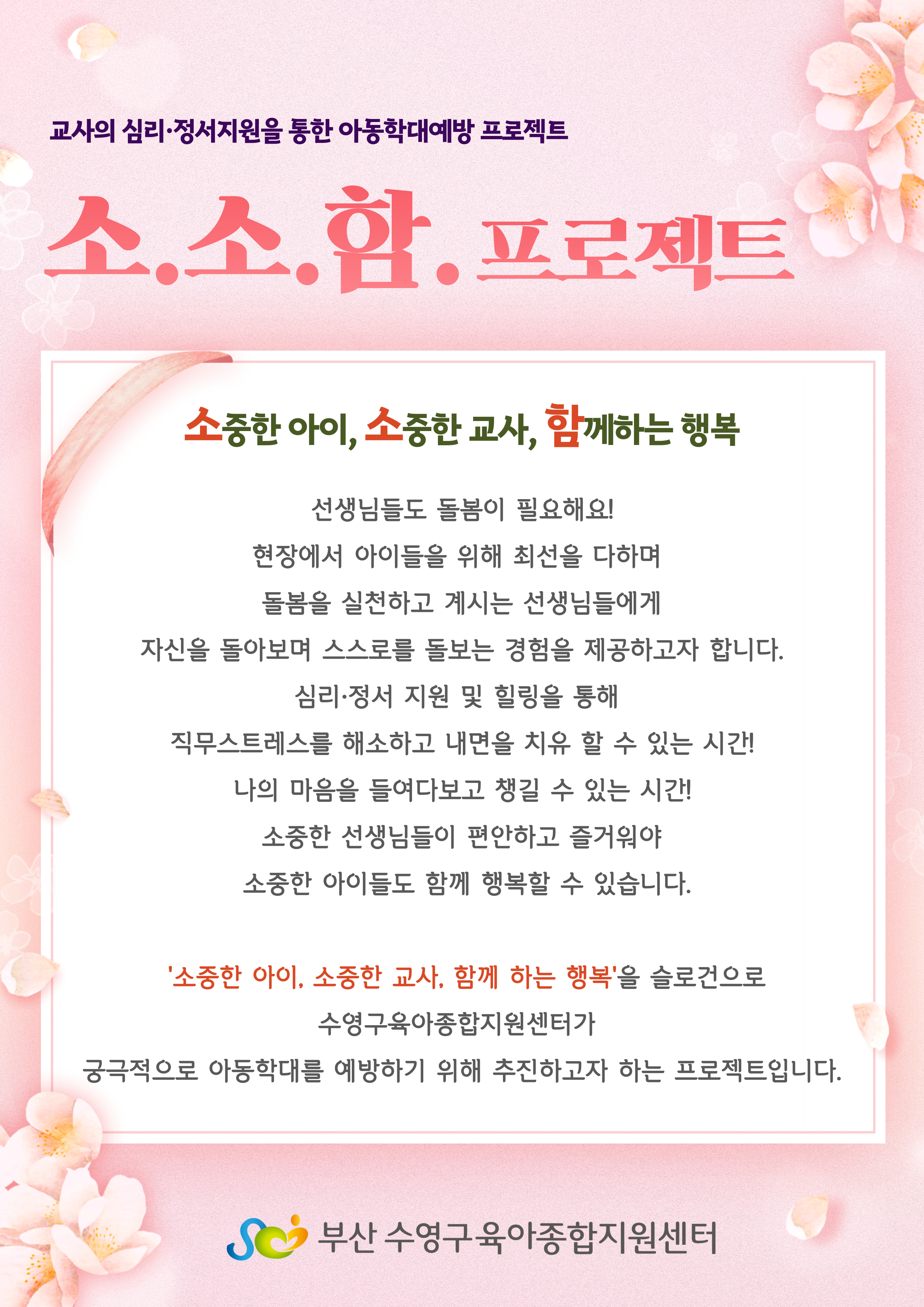 | ±âŸ»çÇ× | ¡Ø ¼Ò.¼Ò.ÇÔ. (¼ÒÁßÇÑ ¾ÆÀÌ, ¼ÒÁßÇÑ ±³»ç, ÇÔ²²ÇÏ´Â Çູ) ¡Ø ±³»çÀÇ ½É¸®¡¤Á¤¼ Áö¿øÀ» ÅëÇÑ ¾Æµ¿Çд뿹¹æ ÇÁ·ÎÁ§Æ® ¡Ø º¸À°°æ·Â 3³â ¹Ì¸¸ or ÇöÀç ±Ù¹« ±â°ü 3³â ¹Ì¸¸ ±³»ç ¡Ø ¸Å¿ù 1ȸ Âü¼®(ÃÑ 4ȸ) ¡Ø 4ȸ±â Âü¼®ÀÚ¿¡°Ô ¼ö·áÁõ ¹× ¼ÒÁ¤ÀÇ ¼±¹° ÁõÁ¤ |