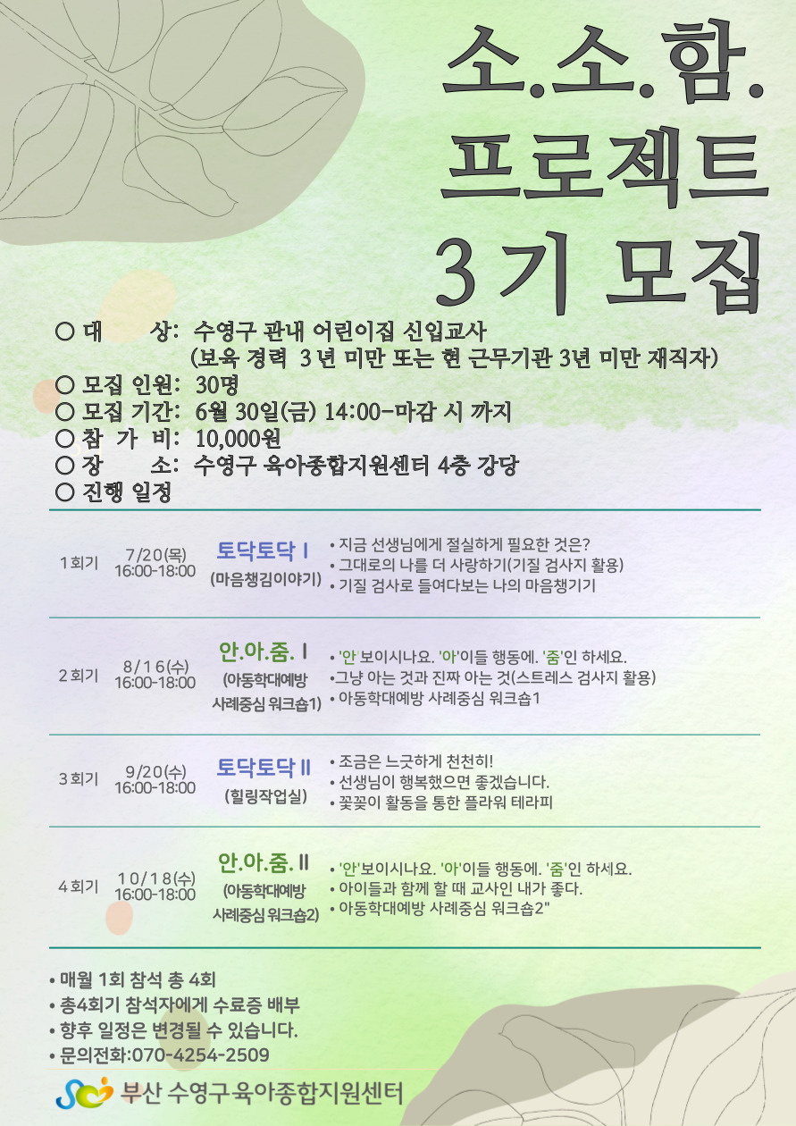 | Á¢¼ö´ë»ó | ¼ö¿µ±¸ °ü³» ¾î¸°ÀÌÁý ½ÅÀÔ±³»ç(°æ·Â 3³â ¹Ì¸¸ ¶Ç´Â ÇöÀç ±Ù¹«±â°ü 3³â ¹Ì¸¸ ±³»ç)) | Á¤¿ø | 30¸í (½Åû: 30) |