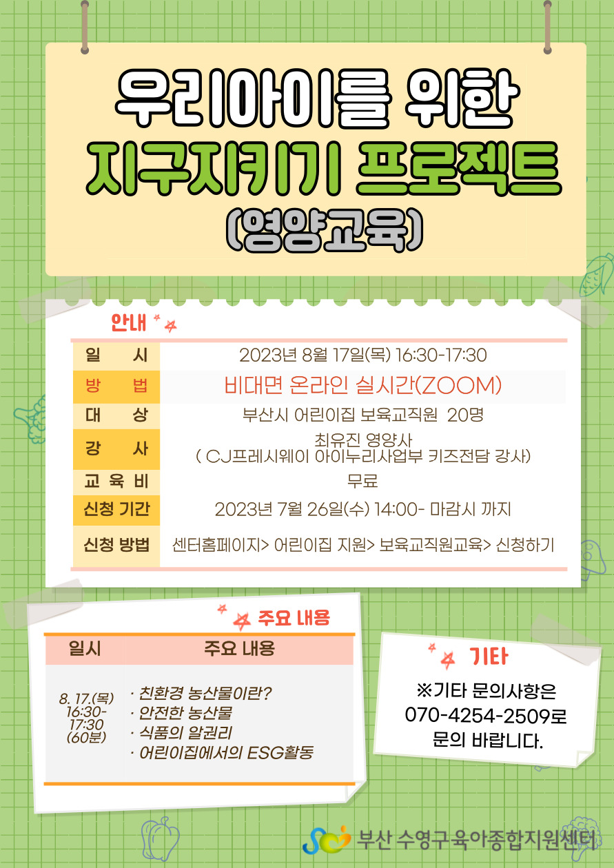 | ½Åû±â°£ | 2023-07-26(¼ö) 14½Ã ~ ¸¶°¨ ½Ã±îÁö (ºÎ»ê½Ã ¾î¸°ÀÌÁý º¸À°±³Á÷¿ø) | ||