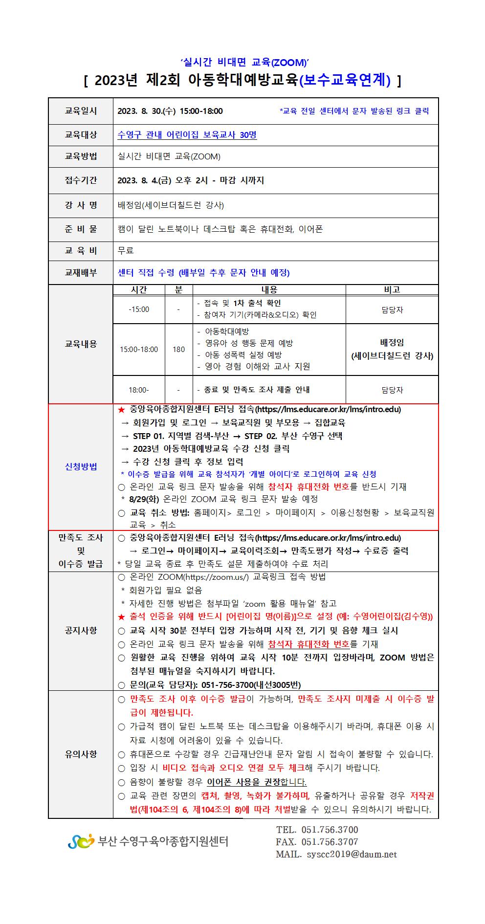 | ±âŸ»çÇ× | ¡Ú ½Åû¹æ¹ý: Áß¾ÓÀ°¾ÆÁ¾ÇÕÁö¿ø¼¾ÅÍ E·¯´× Á¢¼Ó(https://lms.educare.or.kr/lms/intro.edu) ¡æ ȸ¿ø°¡ÀÔ ¹× ·Î±×ÀÎ ¡æ º¸À°±³Á÷¿ø ¹× ºÎ¸ð¿ë ¡æ ÁýÇÕ±³À° ¡æ STEP 01. Áö¿ªº° °Ë»ö-ºÎ»ê ¡æ STEP 02. ºÎ»ê ¼ö¿µ±¸ ¼±Åà ¡æ 2023³â ¾Æµ¿Çд뿹¹æ±³À° ¼ö° ½Åû Ŭ¸¯ ¡æ ¼ö° ½Åû Ŭ¸¯ ÈÄ Á¤º¸ ÀÔ·Â * À̼öÁõ ¹ß±ÞÀ» À§ÇØ ±³À° Âü¼®ÀÚ°¡ ¡®°³º° ¾ÆÀ̵𡯷Π·Î±×ÀÎÇÏ¿© ±³À° ½Åû ¡Û ¿Â¶óÀÎ ±³À° ¸µÅ© ¹®ÀÚ ¹ß¼ÛÀ» À§ÇØ Âü¼®ÀÚ ÈÞ´ëÀüÈ ¹øÈ£¸¦ ¹Ýµå½Ã ±âÀç ¡Ø±³À° ½ÃÀÛ 30ºÐ ÈÄ ÀÔÀå ½Ã À̼öó¸® ºÒ°¡ÇÕ´Ï´Ù. ¡ØÃ·ºÎÆÄÀÏÀÇ ZOOM Ȱ¿ë¸Å´º¾óÀ» ²Ä²ÄÈ÷ ÀоîÁֽñ⠹ٶø´Ï´Ù. ¡Ø±³À° ¾È³»¹®¿¡ ÀûÈù »çÇ× ÇÊÈ÷ ÁöÄÑÁֽñ⠹ٶø´Ï´Ù. |