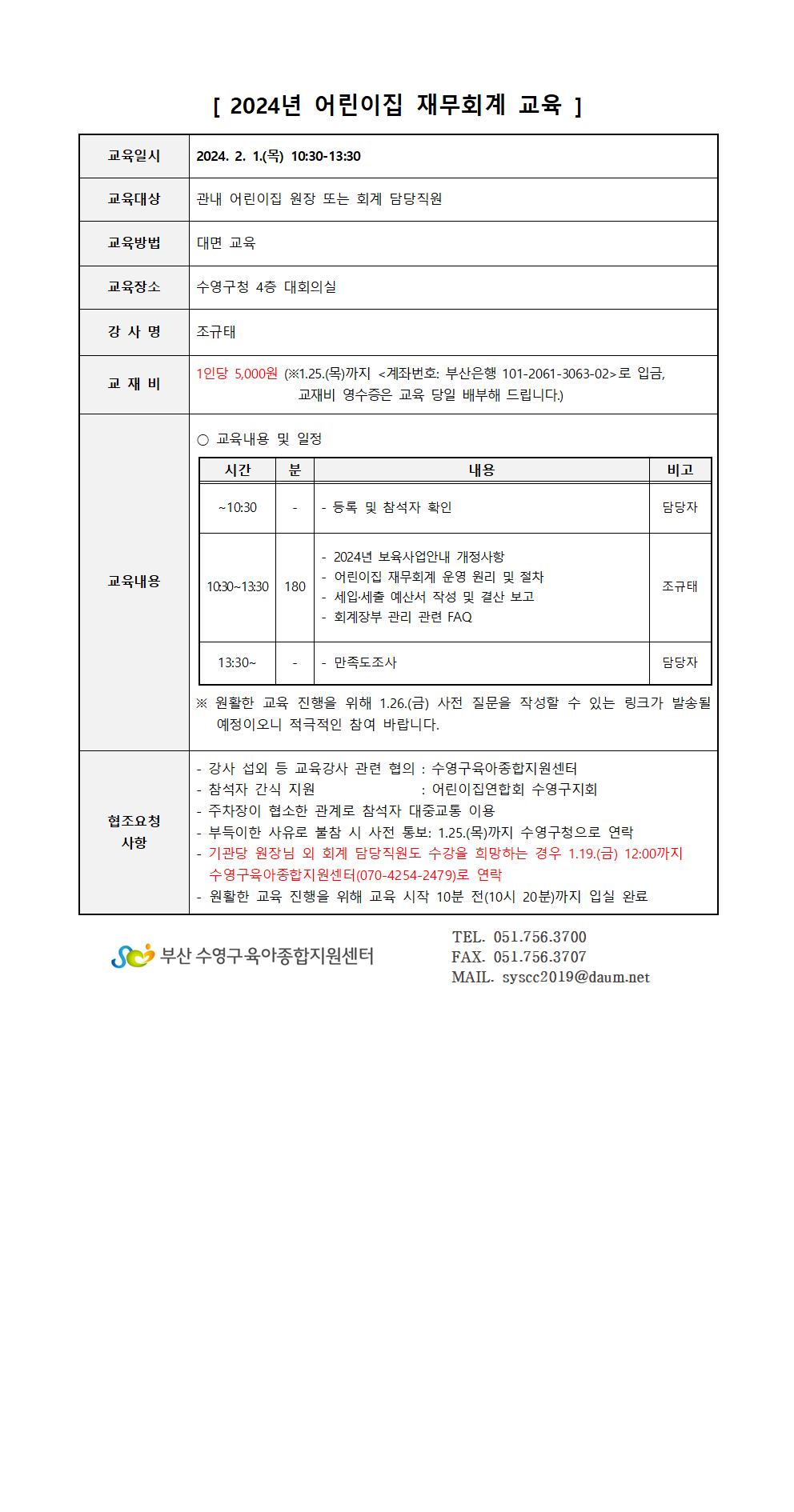 | Á¢¼ö´ë»ó | °ü³» ¾î¸°ÀÌÁý ¿øÀå ¹× È¸°è ´ã´çÀÚ | Á¤¿ø | 63¸í (½Åû: 63) |
