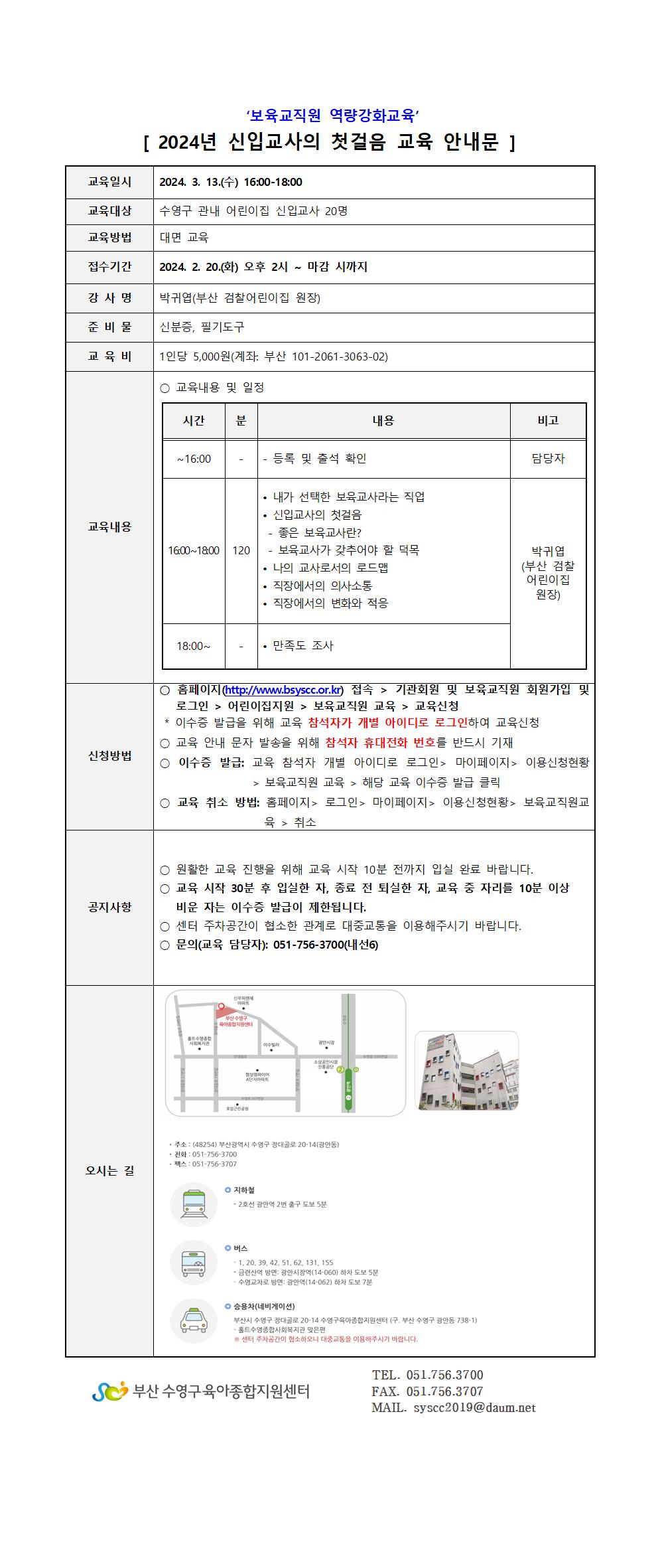| Á¢¼ö´ë»ó | ¼ö¿µ±¸ °ü³» ¾î¸°ÀÌÁý ½ÅÀÔ±³»ç | Á¤¿ø | 20¸í (½Åû: 16) |