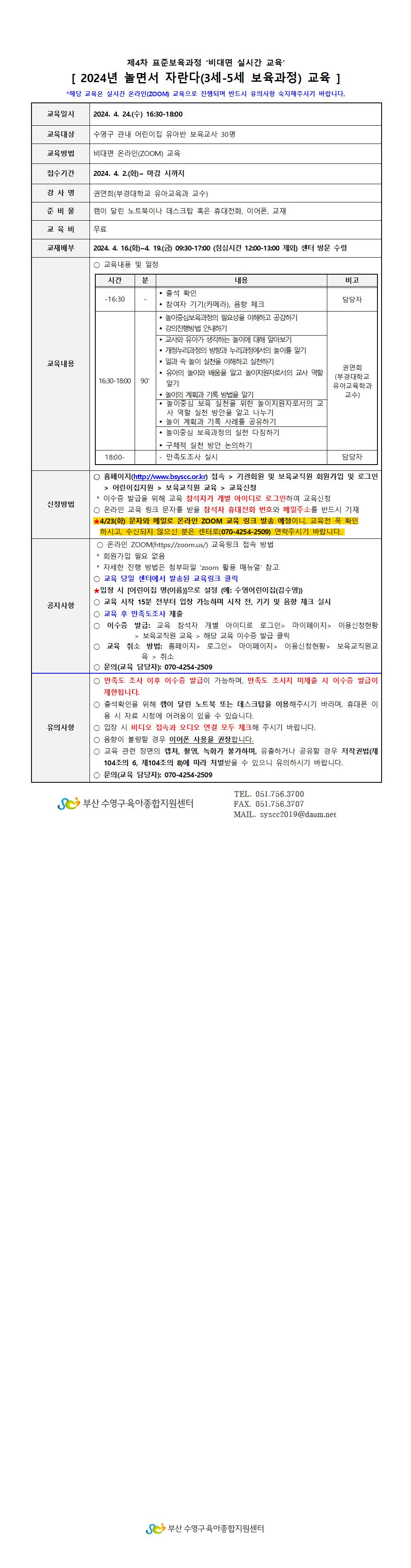 | ±âŸ»çÇ× | ¡Ø¼ö¿µ±¸ °ü³» ¾î¸°ÀÌÁý ´ç 1ÀÎ ÀÌ»ó Çʼö ±³À°ÀÔ´Ï´Ù. ¡Ø½Ç½Ã°£ ¿Â¶óÀÎ(ZOOM) ±³À°À¸·Î ÁøÇàµÇ¸ç ¹Ýµå½Ã À¯ÀÇ»çÇ× ¼÷ÁöÇØÁֽñ⠹ٶø´Ï´Ù. ¡Ø½Åû ÈÄ ¼ö¾÷ÀÏ Àü±îÁö ±³À縦 ¼ö·ÉÇØÁֽñ⠹ٶø´Ï´Ù. ¡Ø±³À° ¾È³»¹®¿¡ ÀûÈù ³¯Â¥ ¹× ½Åû ½Ã°£À» ÇÊÈ÷ ÁöÄÑÁֽñ⠹ٶø´Ï´Ù. ¡Ø±³À° ½ÃÀÛ 30ºÐ ÀÌÈÄ Âü¿©ÇÏ´Â °æ¿ì À̼öÁõ ¹ß±Þ ºÒ°¡ÇÕ´Ï´Ù. ¡Ø¹Ýµå½Ã ¾È³»¹® ¼÷Áö¹Ù¶ø´Ï´Ù. |
