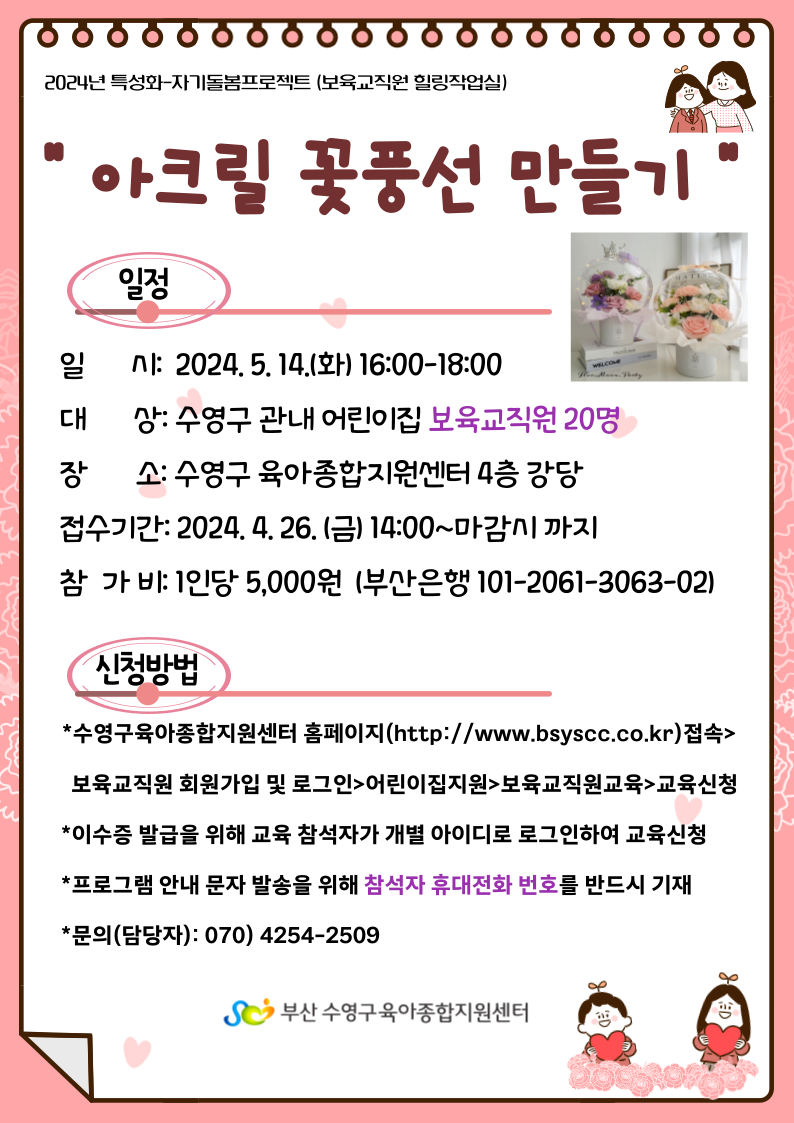 | ½Åû±â°£ | 2024-04-26(±Ý) 14½Ã ~ ¸¶°¨ ½Ã±îÁö (¼ö¿µ±¸ °ü³» ¾î¸°ÀÌÁý º¸À°±³Á÷¿ø) | ||