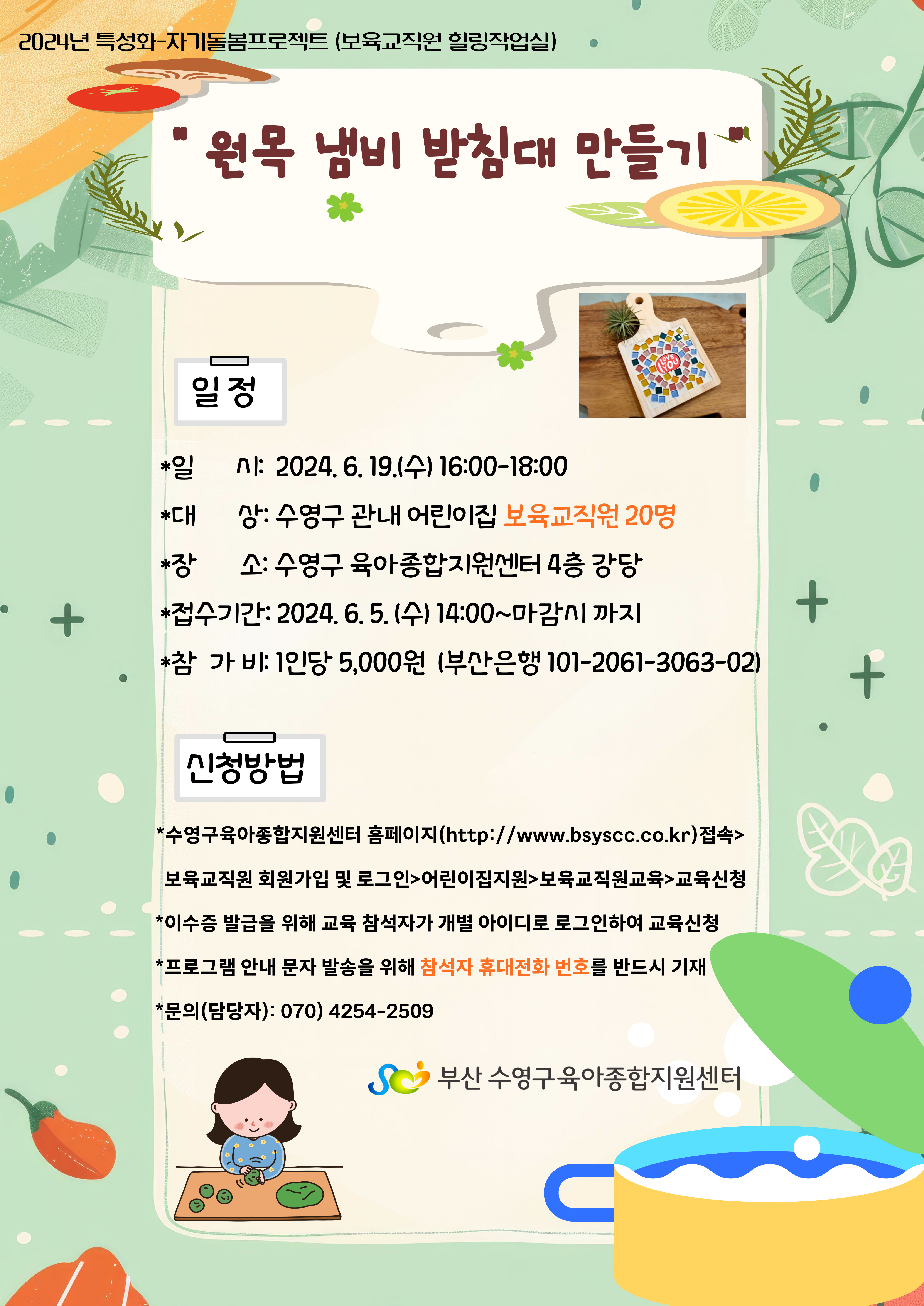 | Á¢¼ö´ë»ó | ¼ö¿µ±¸ °ü³» ¾î¸°ÀÌÁý º¸À°±³Á÷¿ø | Á¤¿ø | 20¸í (½Åû: 20) |