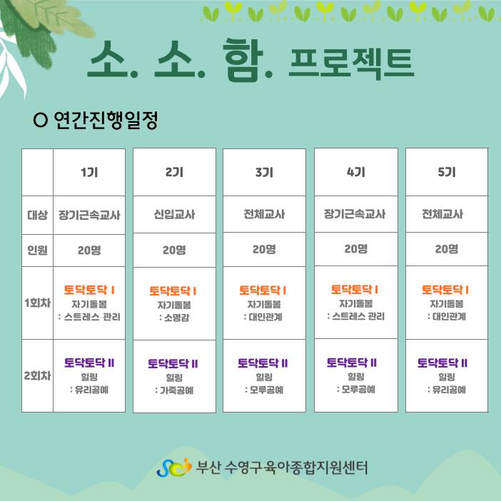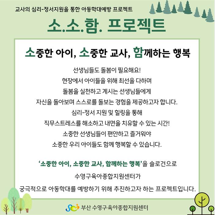 | ±âŸ»çÇ× | ¡Ø ¼Ò.¼Ò.ÇÔ. (¼ÒÁßÇÑ ¾ÆÀÌ, ¼ÒÁßÇÑ ±³»ç, ÇÔ²²ÇÏ´Â Çູ) ¡Ø ±³»çÀÇ ½É¸®¡¤Á¤¼ Áö¿øÀ» ÅëÇÑ ¾Æµ¿Çд뿹¹æ ÇÁ·ÎÁ§Æ® ¡Ø 4±â´Â º¸À°°æ·Â 5³â ÀÌ»ó Àå±â±Ù¼Ó ±³»ç¸¦ ´ë»óÀ¸·Î ÇÕ´Ï´Ù. ¡Ø ÃÑ 2ȸ±â Âü¼®°ú ÇÔ²² ¾È.¾Æ.ÁÜ. ¾Æµ¿ÇÐ´ë »ç·ÊÁ߽ɱ³À° [9/25(¼ö)]¿¡ Âü¼®ÇÏ¼Å¾ß ¼ö·áÁõÀÌ ¹ß±ÞµË´Ï´Ù. ¡Ø ¾È.¾Æ.ÁÜ. ¾Æµ¿ÇÐ´ë »ç·ÊÁ߽ɱ³À° [4/11(¸ñ)], [5/16(¸ñ)], [5/23(¸ñ)]¿¡ Âü¼®ÇÑ ºÐµéÀº ÃÑ 2ȸ±â Âü¼®À¸·Î ¼ö·áÁõÀÌ ¹ß±ÞµË´Ï´Ù. ¡Ø ¾È.¾Æ.ÁÜ. ¾Æµ¿ÇÐ´ë »ç·ÊÁ߽ɱ³À°Àº º°µµ ½Åû ÇÊ¿ä - ¼ö¿µ±¸ ¾î¸°ÀÌÁý ¿¬ÇÕȸ ÅëÇØ ½Åû |