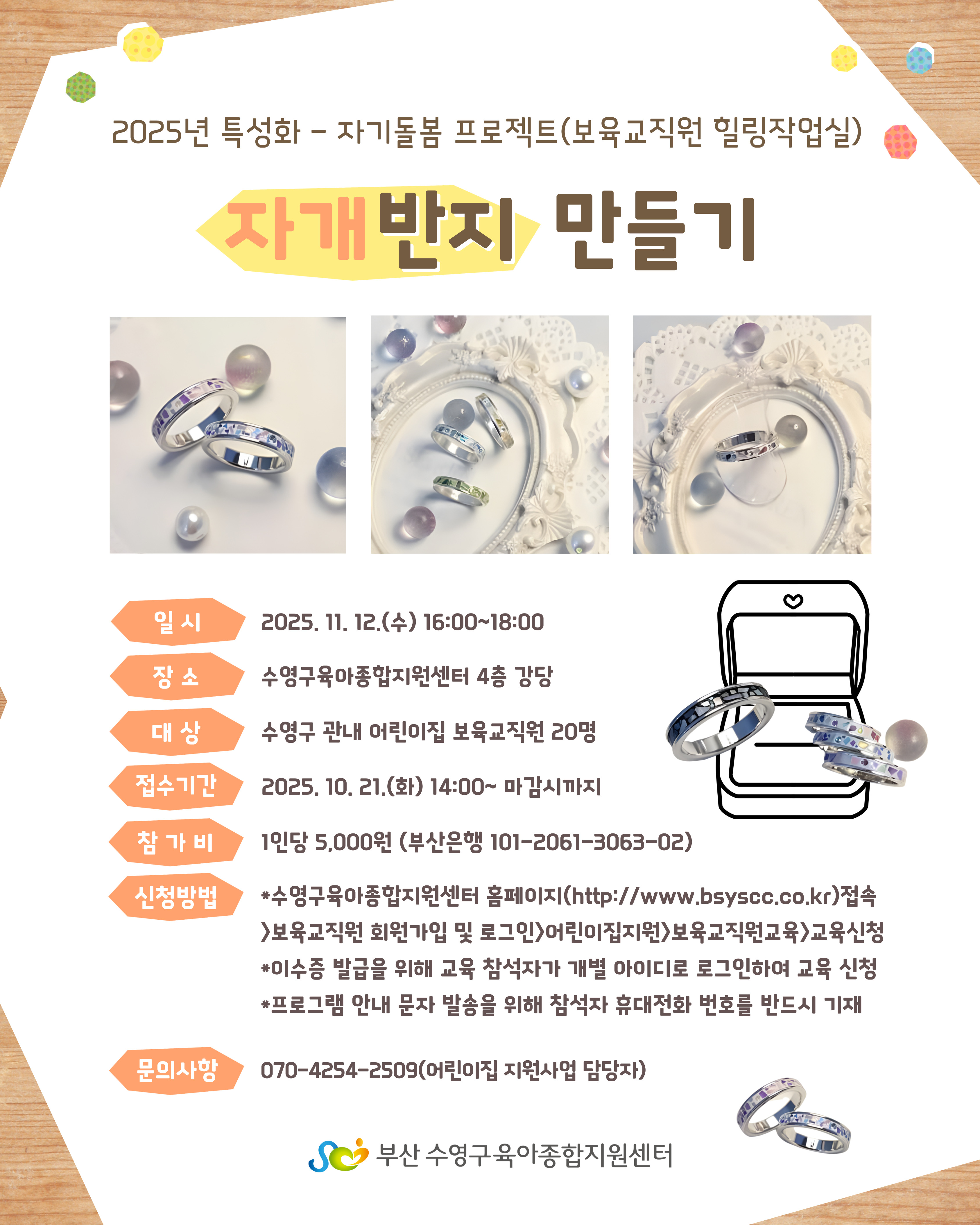 ½Åû±â°£ | 2025-10-21(È) 14½Ã ~ ¸¶°¨ ½Ã±îÁö (¼ö¿µ±¸ °ü³» ¾î¸°ÀÌÁý º¸À°±³Á÷¿ø) | ||