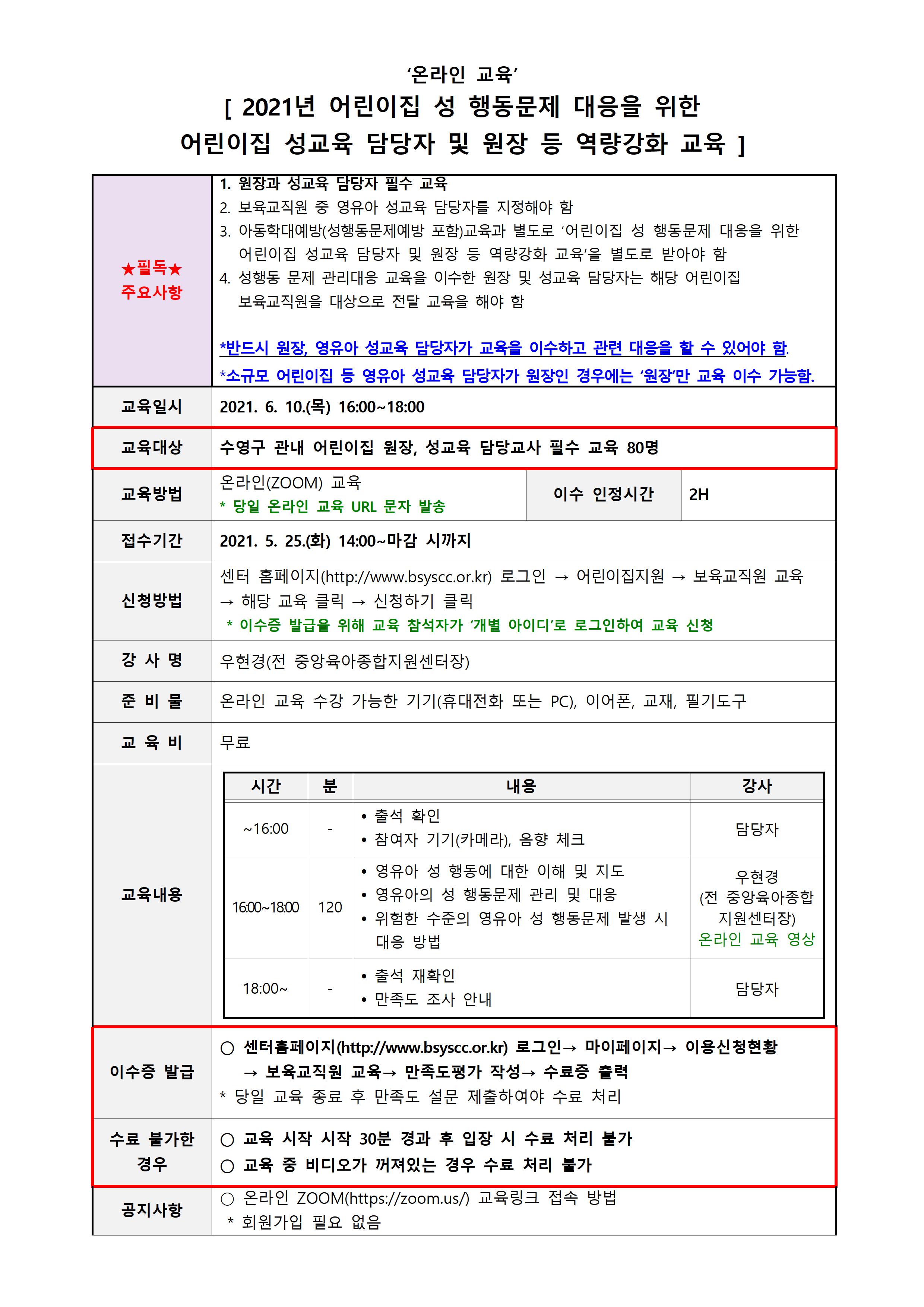| Á¢¼ö´ë»ó | ¼ö¿µ±¸ °ü³» ¾î¸°ÀÌÁý ¿øÀå, ¼º±³À° ´ã´çÀÚ | Á¤¿ø | 80¸í (½Åû: 71) |